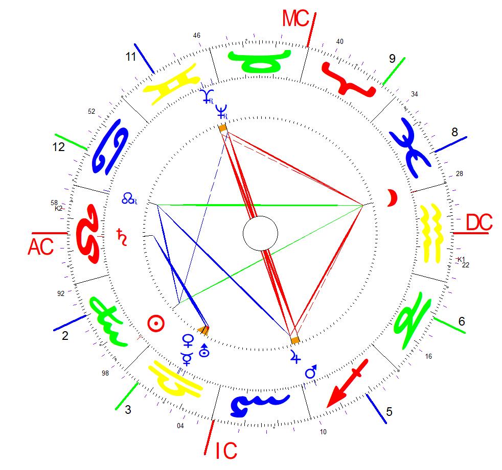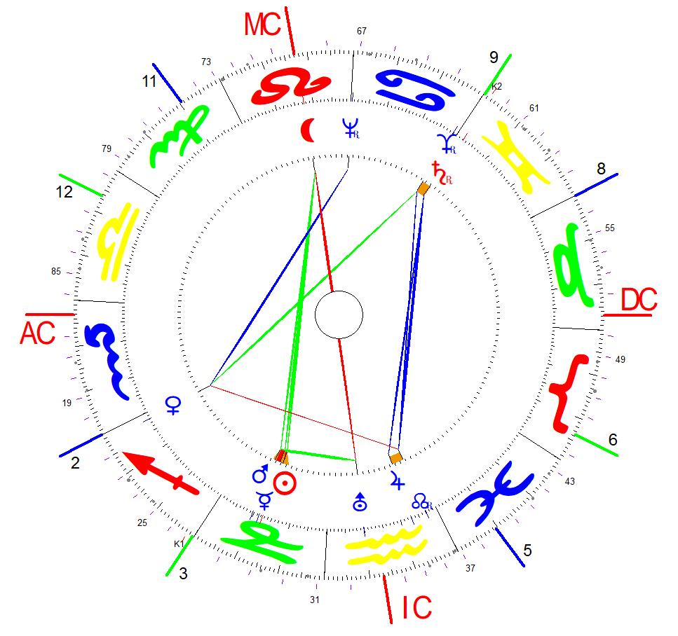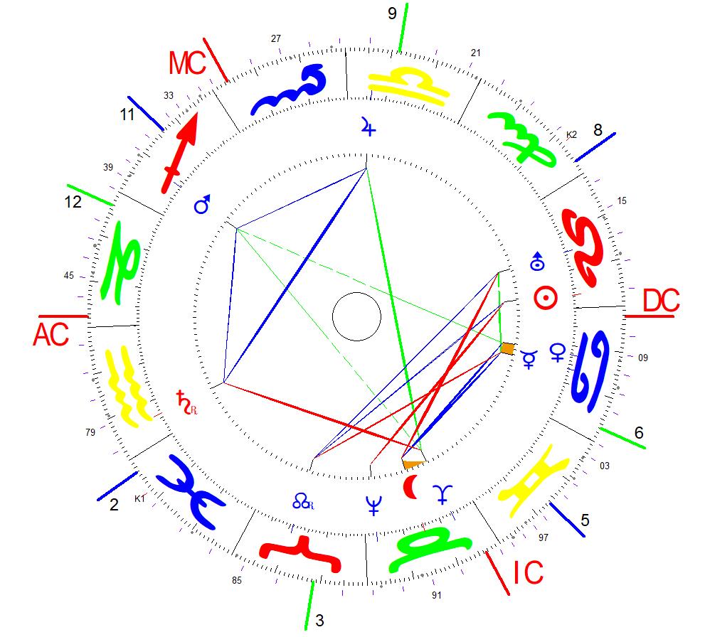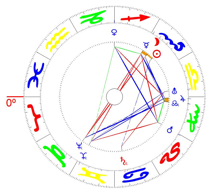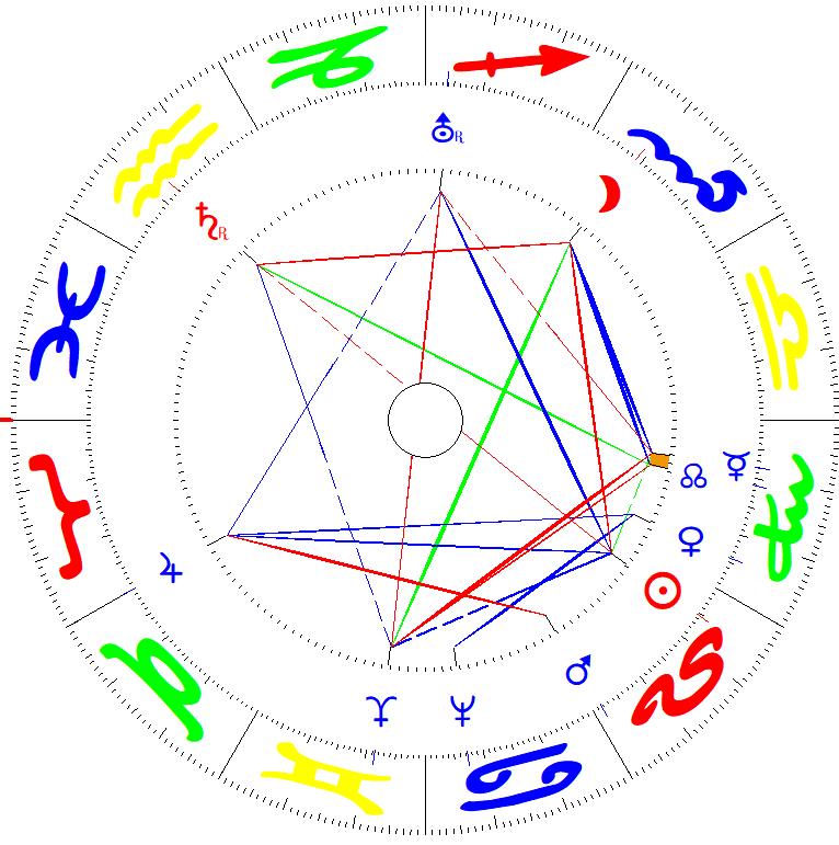 Sabina Spielrein *26.10.1885 Jul. Cal. • o.Z. • X • Rostov na Donu (RU), 1923 zog sie aus der Schweiz in die Sowjetunion, wo sie u.a. Mitarbeiterin am Staatlichen Psychoanalytischen Institut in Moskau wurde. Der Versuch psychoanalytische Ansätze mit dem Marxismus zu verbinden, im Sinne des späteren «Freudo-Marxismus» (z.B. Wilhelm Reich) endete in den 1930er Jahren, als die Psychoanalyse dort als «bürgerlich-dekadent bezeichnet wurde. An ihrem Leistungsdreieck ist wieder der Mond beteiligt, in «fast» Opposition zum Pluto. C.G. Jungs Thema: zu rational und überhöhtes Selbst. Bestätigung sucht er bei Frauen mit Mond in exponierter Stellung und eingebundem Pluto.