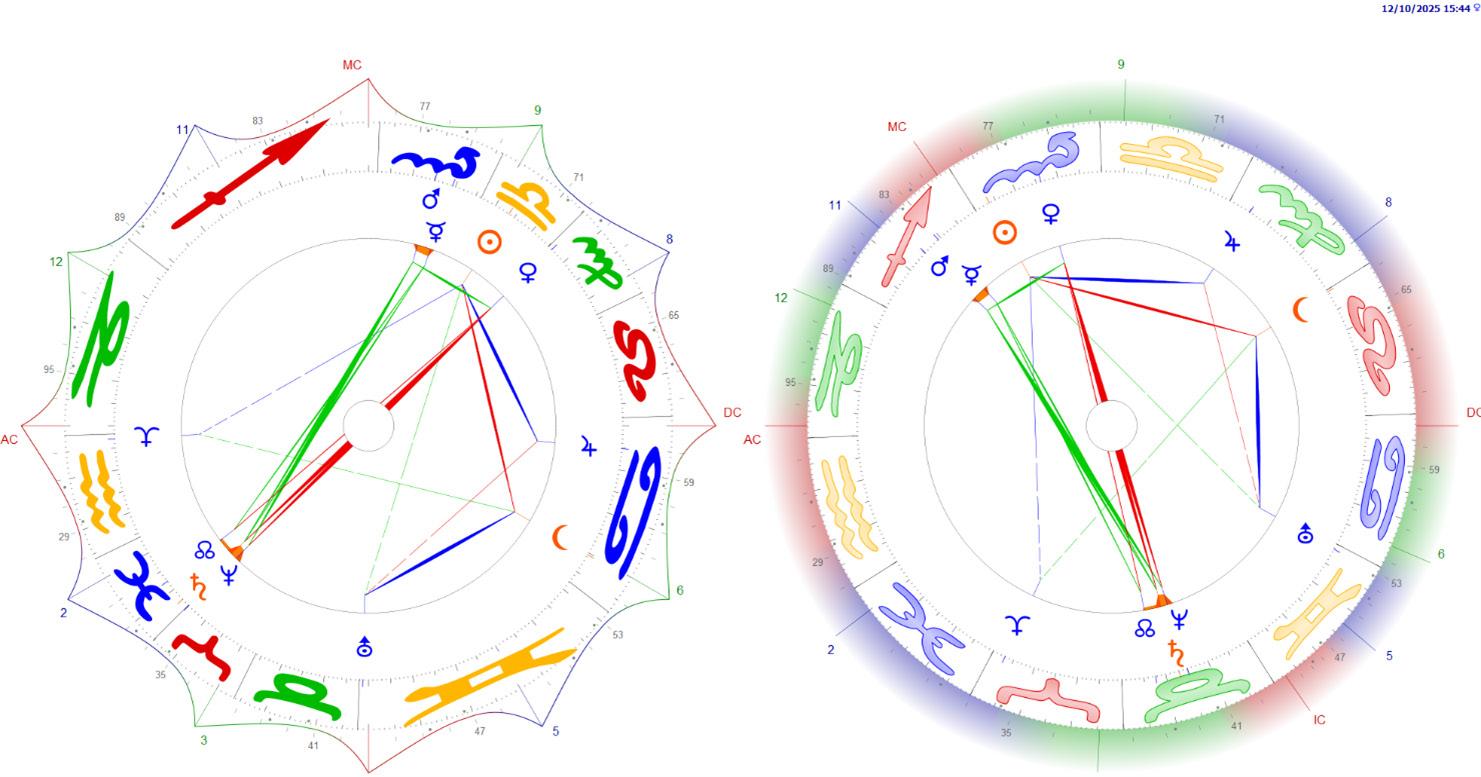 6. Mentalität oder die angeborene Eigenart des Denkens kann aus der Zeichenstellung der Sonne, des Merkurs und deren Radix-Aspektgeber abgleitet werden. Selbstentwickelte Denkschablonen, wie Lebensphilosophien, auch als Schutzmechanismus, die vorwiegend im jungen Erwachsenenalter herausgebildet werden, können aus der Häuserstellung von Sonne und Merkur und deren Häuseraspekte abgeleitet werden.