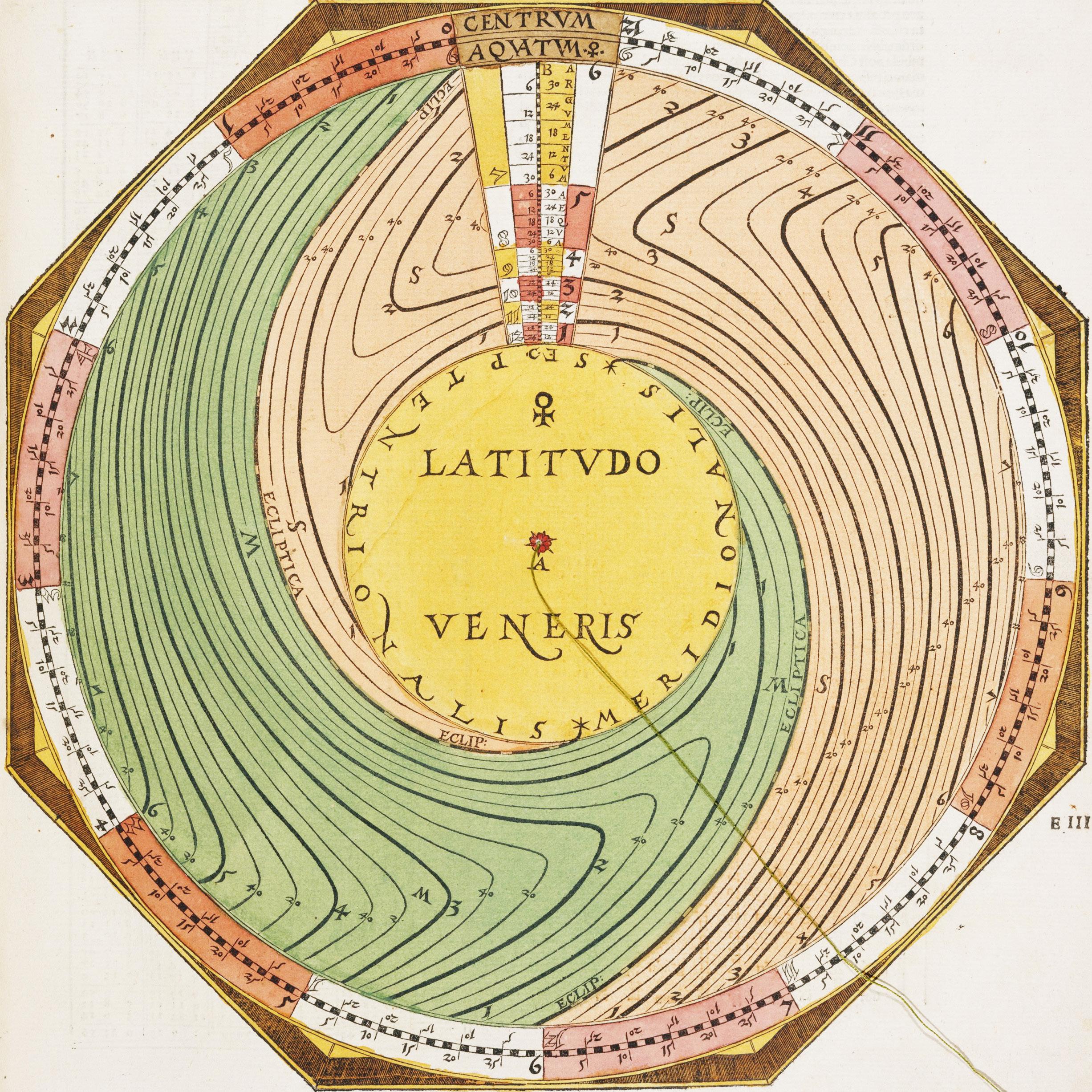 «Latitudo Veneris» Als schnell laufender Planet, spielt die Venus eine wichtige Rolle in der Navigation, der Orts- und Zeitbestimmung. Sie ist wie Sonne und Mond gut sichtbar. Ihre Helligkeit ist ein guter Marker für Zeit und Richtung. Leider vollführt die Venus eine für den Betrachter von der Erde aus komplizierte Bewegung. Gute Tabellen waren ein dringliches Erfordernis. Apian entwickelte eine Scheibe mit Messfaden, die die Bahnabweichungen der Venus berücksichtigte. Die Astronomen seiner Zeit versuchten, die komplizierte Venusbewegung zu einem Zentrum ins Verhältnis zu setzen. Apian stützte sich bei der Erstellung dieser Scheibe auf eine damalige Autorität, den Astronomen Rabbi Abraham Zacuto. Dieser hatte den Himmel sorgfältig beobachtet und sein Interesse vor allem