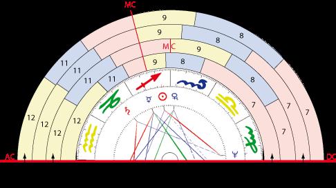 Zwischenkriegszeit recht weite Verbreitung gefunden. Bei der Ostpunkt-Methode wird anstelle der Nord-Süd Line die Linie zwischen Ost und West als Achse verwendet. Bei der ZenithMethode liegen die zwölf Sektoren um die senkrechte Achse vom Zenith zum Nadir herum. Die Aufteilung erfolgt am lokalen Horizont in äquale 30°-Sektoren. Dieses Vorgehen ist astronomisch inspiriert, denn die Astronomen verwenden zum Einrichten ihrer Teleskope das Azimuth (Gradeinteilung des Horizontes) und die Höhe über dem Horizont um ihre Geräte auf einen bestimmten Stern einzustellen. Diese letztgenannten Methoden haben den emminenten Nachteil, dass, ähnlich den äqualen Systemen, entweder der Aszendent oder das MC wieder nicht mit den gegebenen natürlichen Voraussetzungen übereinstimmen. Das System des Morinus benutzt die Achse der ekliptikalen Pole und errichtet darüber sechs Grosskreise, die sie rotieren lässt. Die Schnittpunkte mit dem Tierkreis bestimmen die Häuserspitzen. Dieses Häusersystem hat in französisch sprechenden Ländern noch relativ weite Verbreitung. Die Axiale Methode ist eigentlich nur eine Vereinfachung des Systems des Morinus.
