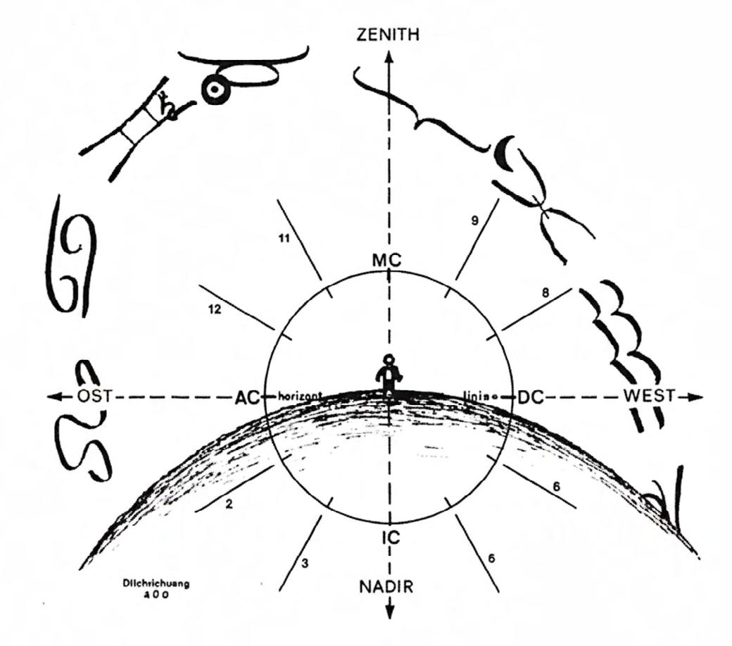gibt eine Vierteilung des Himmels- und Erdraumes. Wieder lagen Wahrnehmung und Wirklichkeit weit auseinander. Die Häuser basieren nicht auf dem Lauf der Planeten um die Sonne, sondern auf der Eigenrotation der Erde. Innerhalb von 24 Stunden scheint sich der gesamte Sternenhimmel einmal um den Punkt, an dem der Beobachter steht, herumzudrehen. Dabei entstehen vier markante Punkte, die das Grundgerüst der Häuser bilden: Aszendent (AC): Der Punkt im Osten, der gerade am Horizont aufsteigt. Der Deszendent (DC): Der Punkt im Westen, der gerade untergeht. Das Medium Coeli (MC): Der höchste Punkt am Himmel (Mittagssonne)und das Imum Coeli (IC): Der tiefste Punkt unter dem Horizont (Mitternacht).
