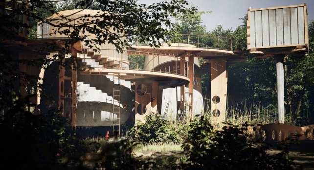 The story I wanted to tell with these renders is that of discovery, so when choosing my framing I focused on having the structure being peered at through the nature surrounding it and partially hiding it with the trees to draw the audience in. Secondary to this was the idea of emulating visuals from a drone stumbling upon this placeandthiscanbeseeninthe previous image as well as my short film HUSK, linked in the films section of this portfolio.