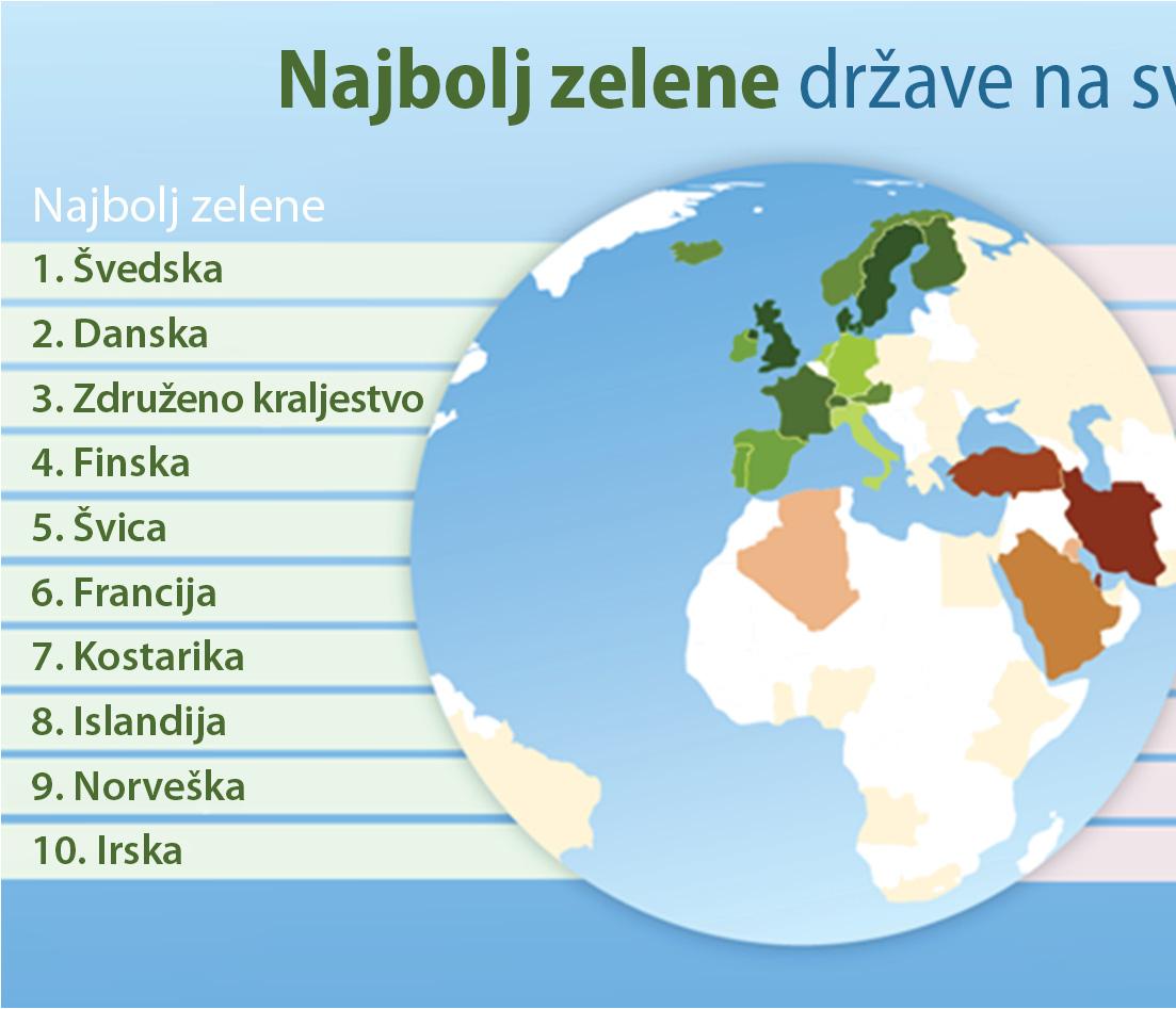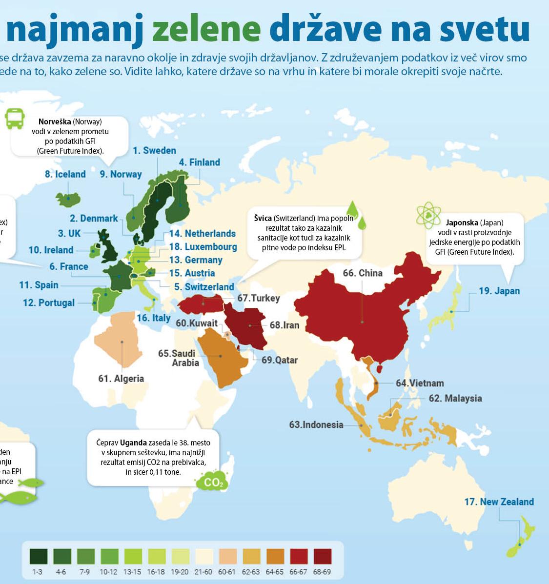 »zelena« država je odraz zavzemanja za zaščito okolja, trajnostne ukrepe ter posledično zdravje državljanov. Z združevanjem podatkov so na angleškem spletnem portalu GreenMatch med seboj primerjali 60 držav.