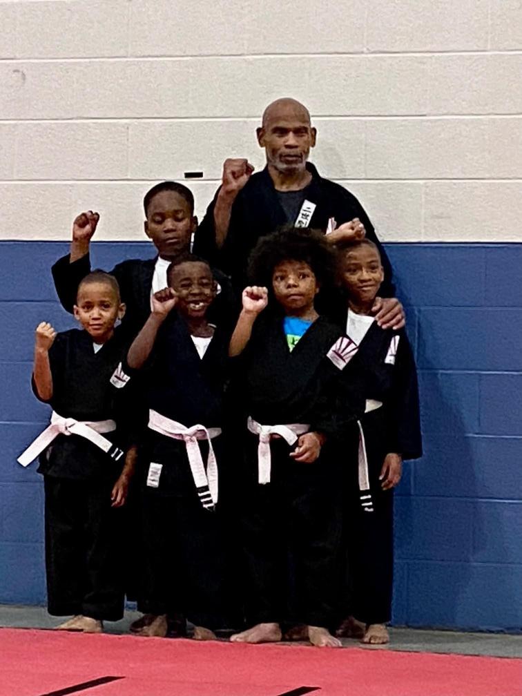 Brother role models and faciliates perserverance, discipline and self control through the EJ Greer Karate Do Jo. Pictured above is a new cohort of 6-8 year olds; regional Black Belt award won by Brother Greer, and the son of a chapter brother who recently was promoted to yellow belt.
