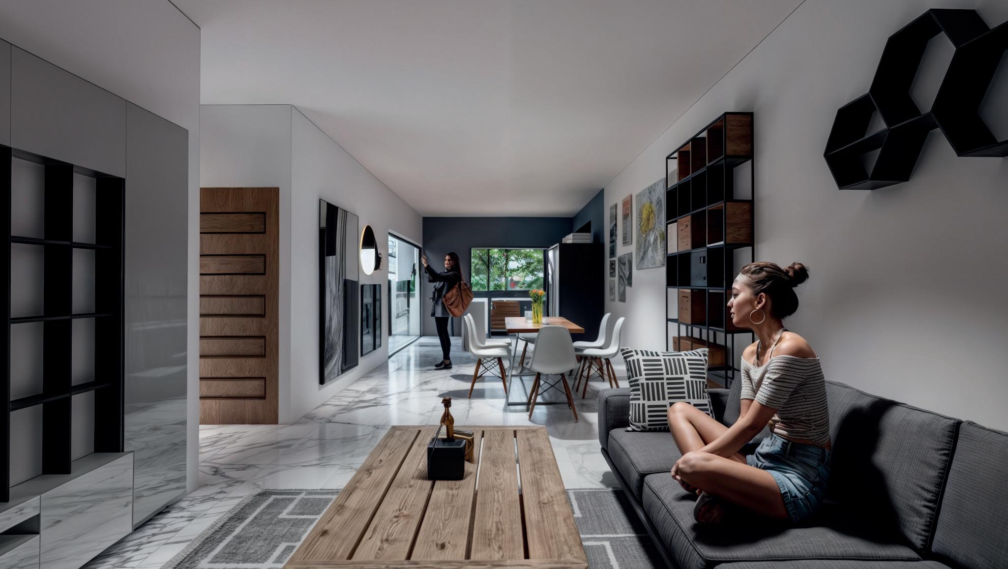El proyecto de casa “Diaphane” es una vivienda unifamiliar de 2 niveles en venta que combina elementos arquitectónicos modernos con enfoque en grandes espacios sociales a través de áreas abiertas y de doble altura.