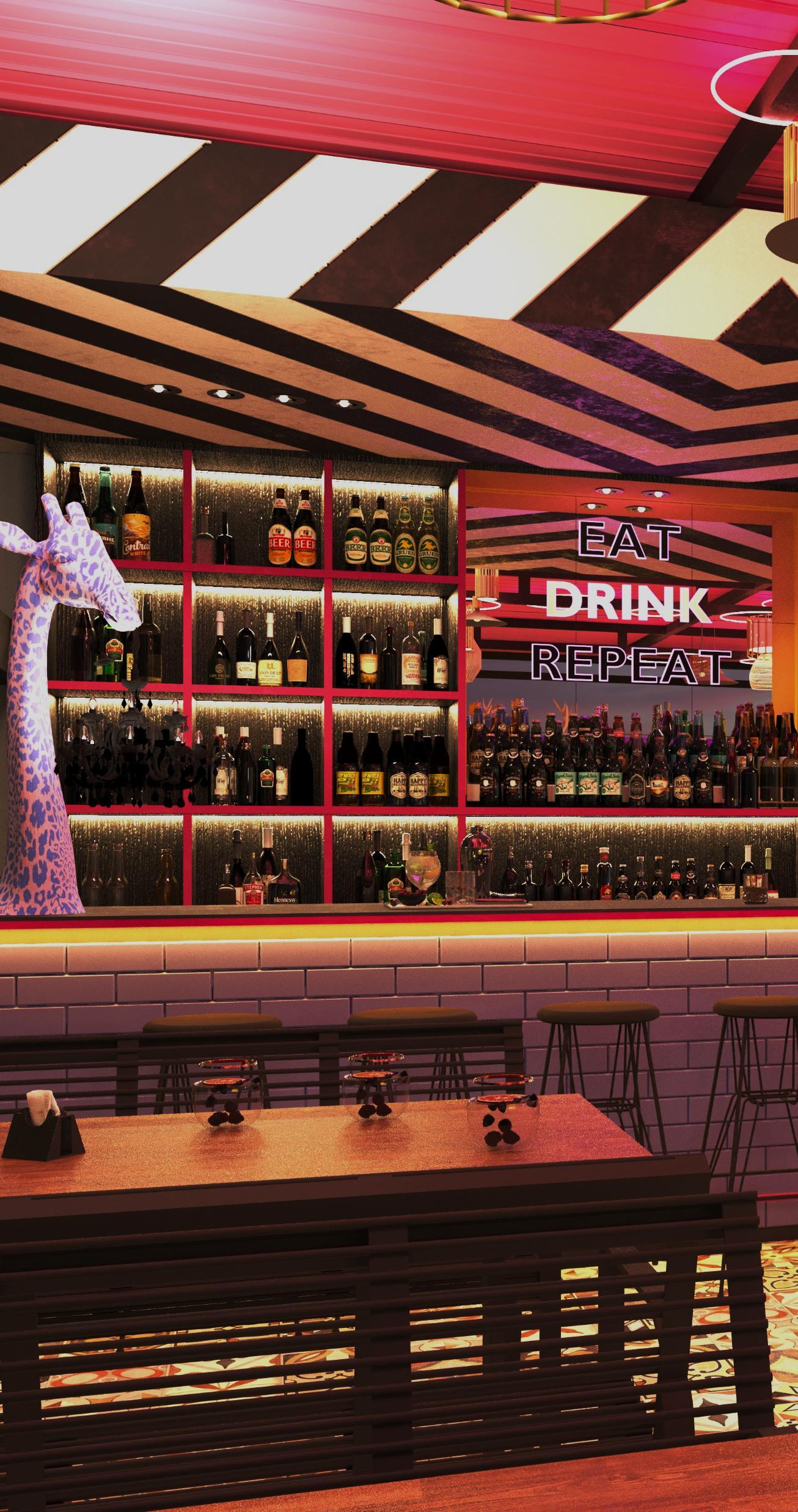 Desde el principio se buscó un diseño que resaltara por su originalidad y tendencia a lo disruptivo, empleando colores fuertes y llamativos, cambios de materiales y baldosas con diferentes texturas, el uso del animal print y el planteamiento de diferentes remates visuales con esculturas, murales, letreros LED y lámparas especiales, que enriquecieran y cautivaran la experiencia de los clientes.