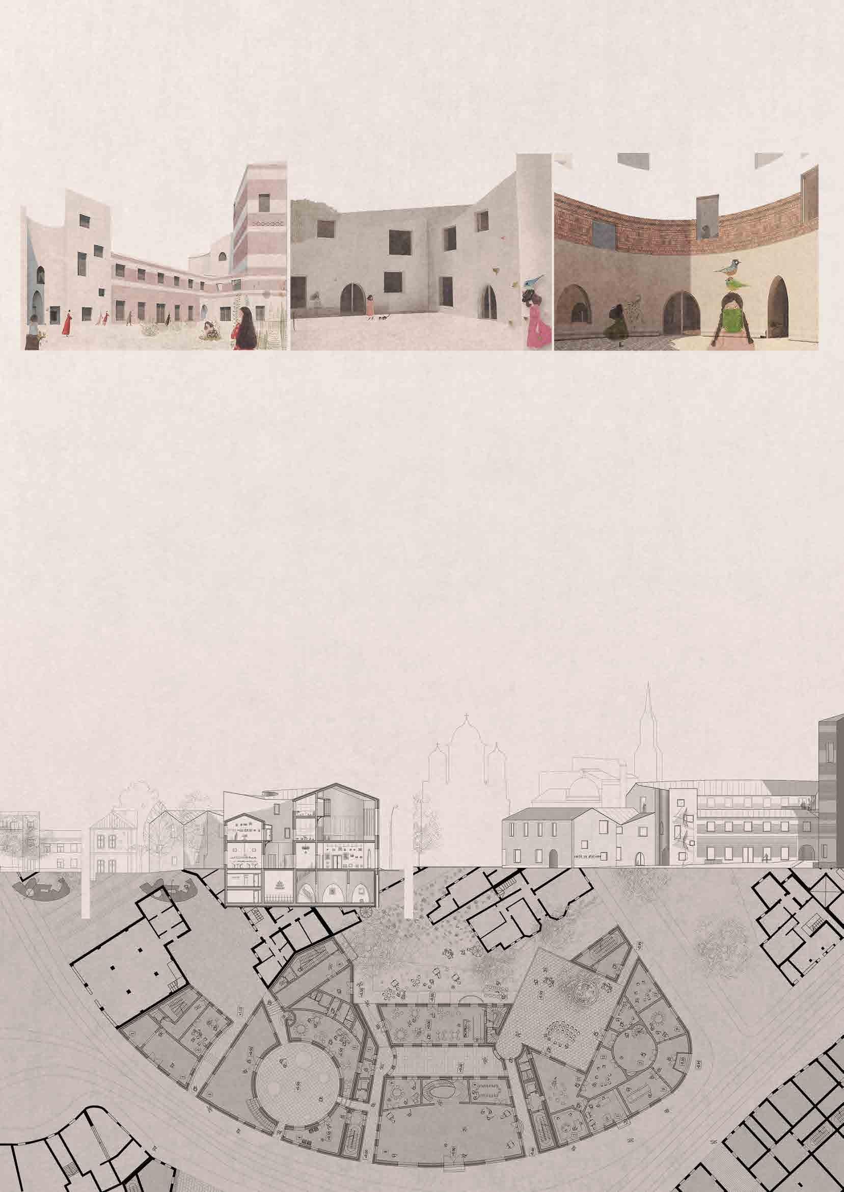 This project begins with the design of various courtyards: the round courtyard, the secret squared courtyard, the garden, the workshop yard. The volume creates a sequence of different spaces through passages and alleys.