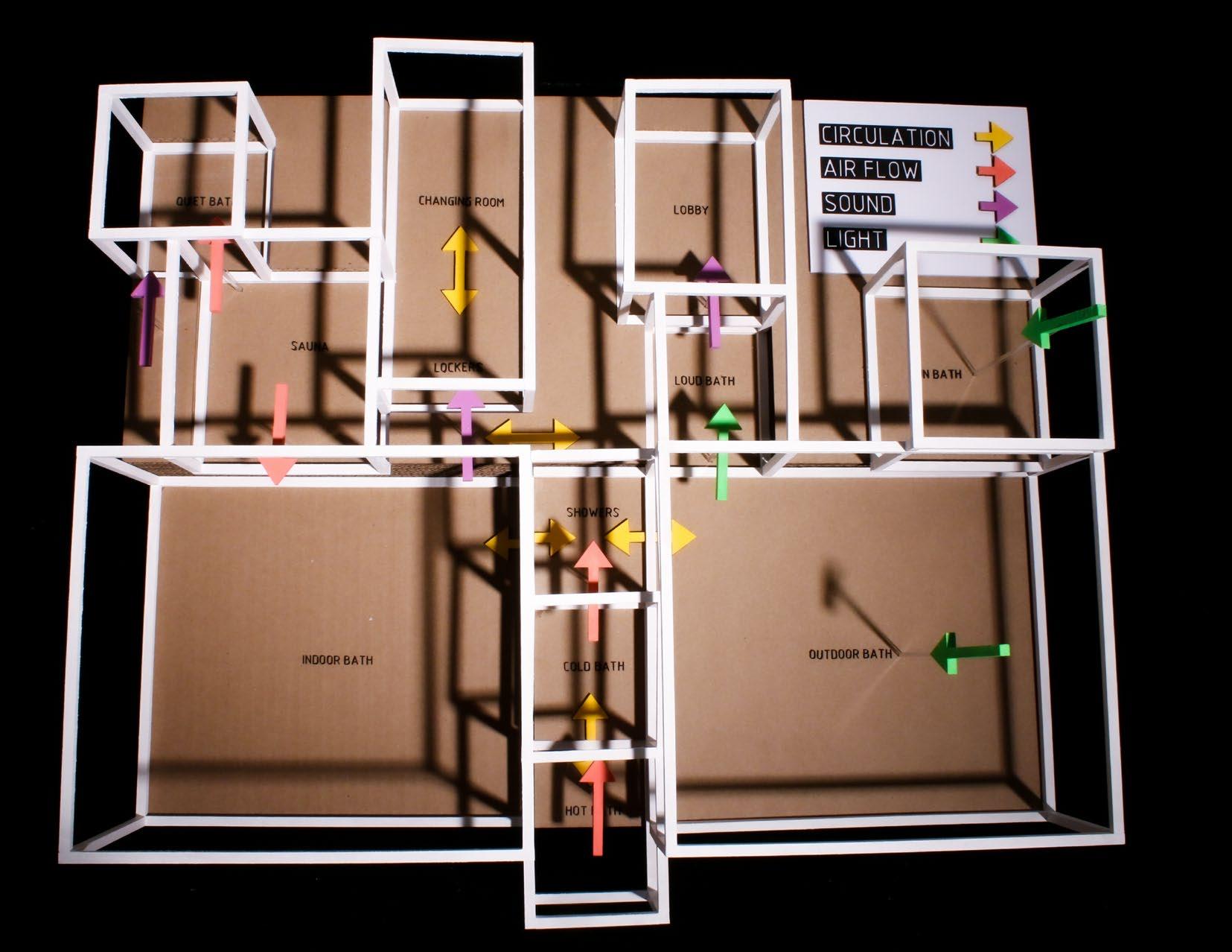 The spa has 12 individual programs so when deciding where to place program we chose to take each possible outcome and place them adjacent to one another. Each of these diagrams was then analyzed to show the relationship’s most desirable attribute. These where categorized by light, sound, airflow (heat) and circulation. We then designed and built a physical representation of the attributes we found to be the most fruitful and where they are placed within the building.