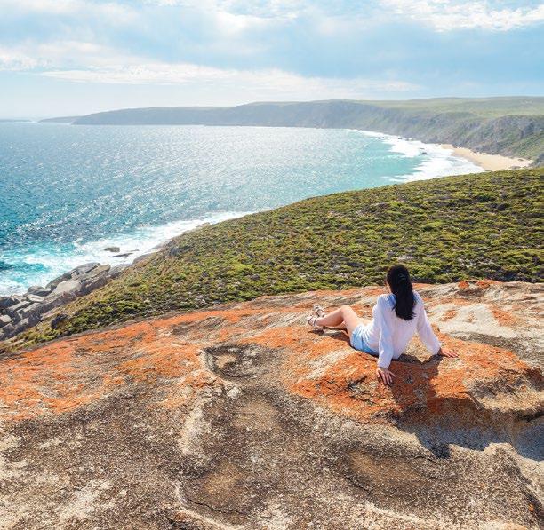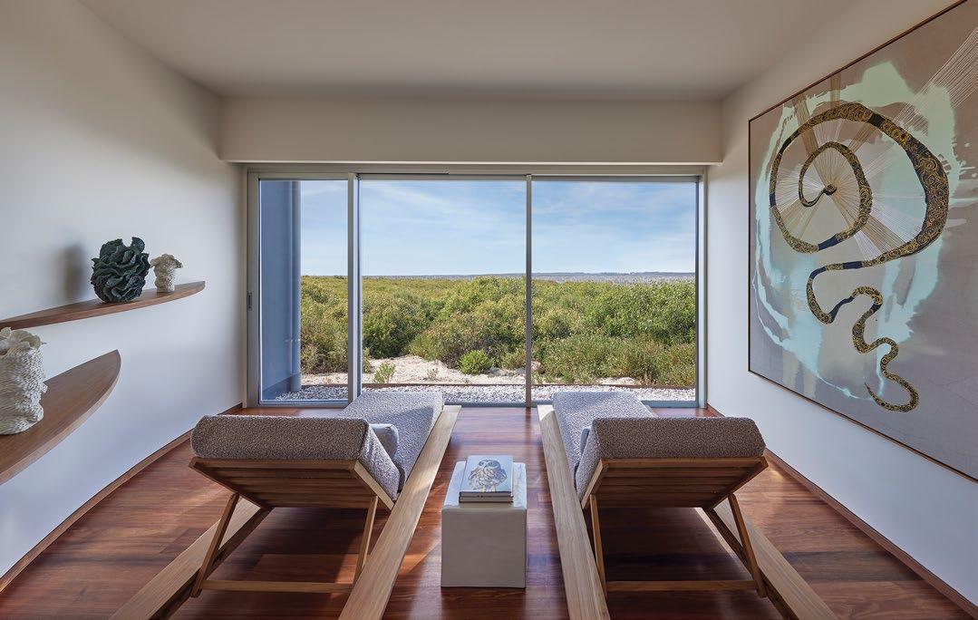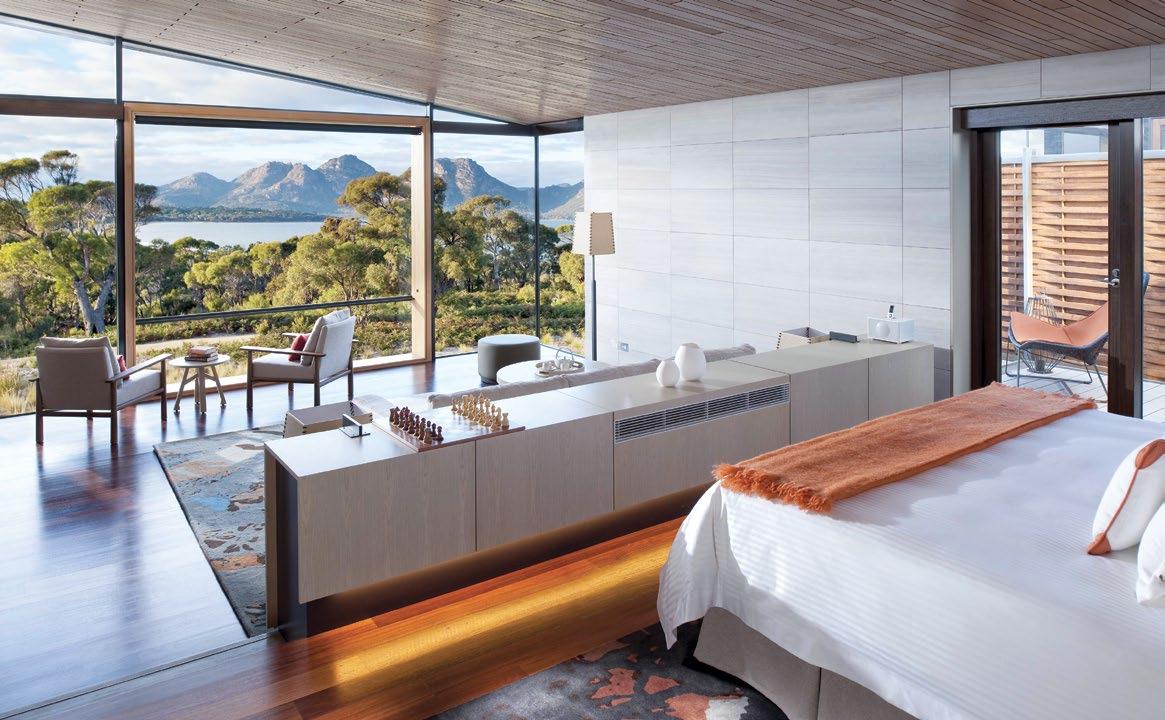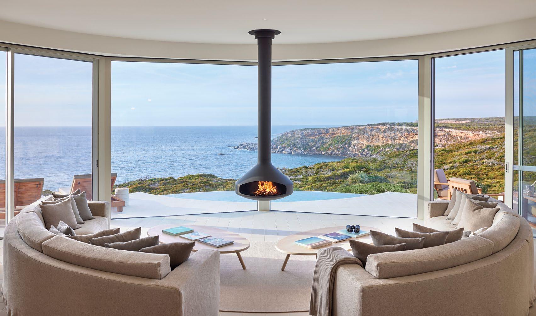 hour and, with welcome drinks in hand, we were swept toward armchairs overlooking the Southern Ocean. They needn’t have poured for us; the great room, centered on a free-standing fireplace, features a generous bar where guests can fix their own drinks and select bottles from the lodge’s extensive South Australian cellar.