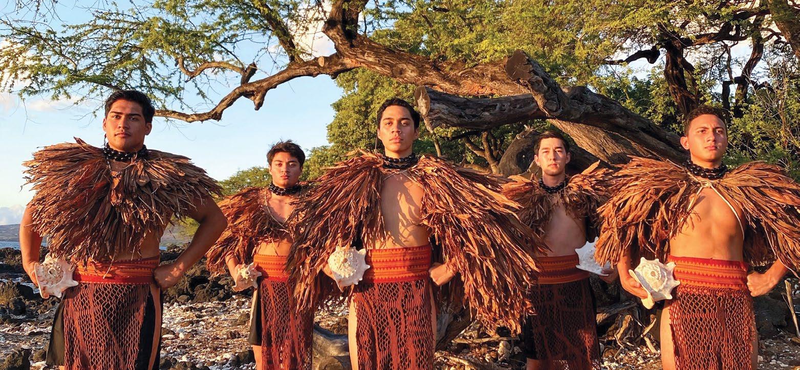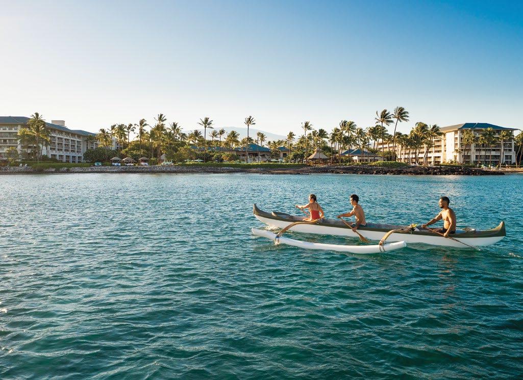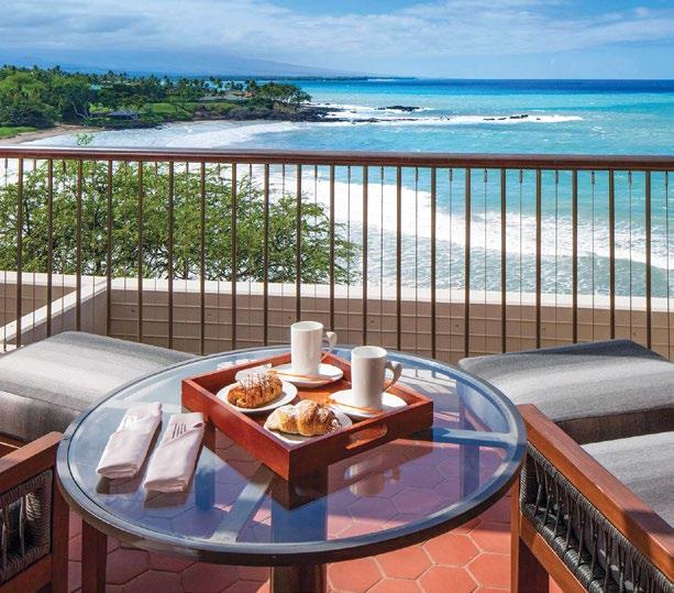 Opened in 1965 by Laurance S. Rockefeller, this property wows, with its sunken garden lined with koi ponds and its openair lobby framed by towering columns that direct one’s gaze toward the sea. Dressed in a brightly colored muumuu, a greeter hugged the family ahead of us. The children knew her by name. Like the original Kona Village Resort, this hotel draws multigenerational guests who return year after year. There is a classic appeal to the 252-room hotel’s mid -
