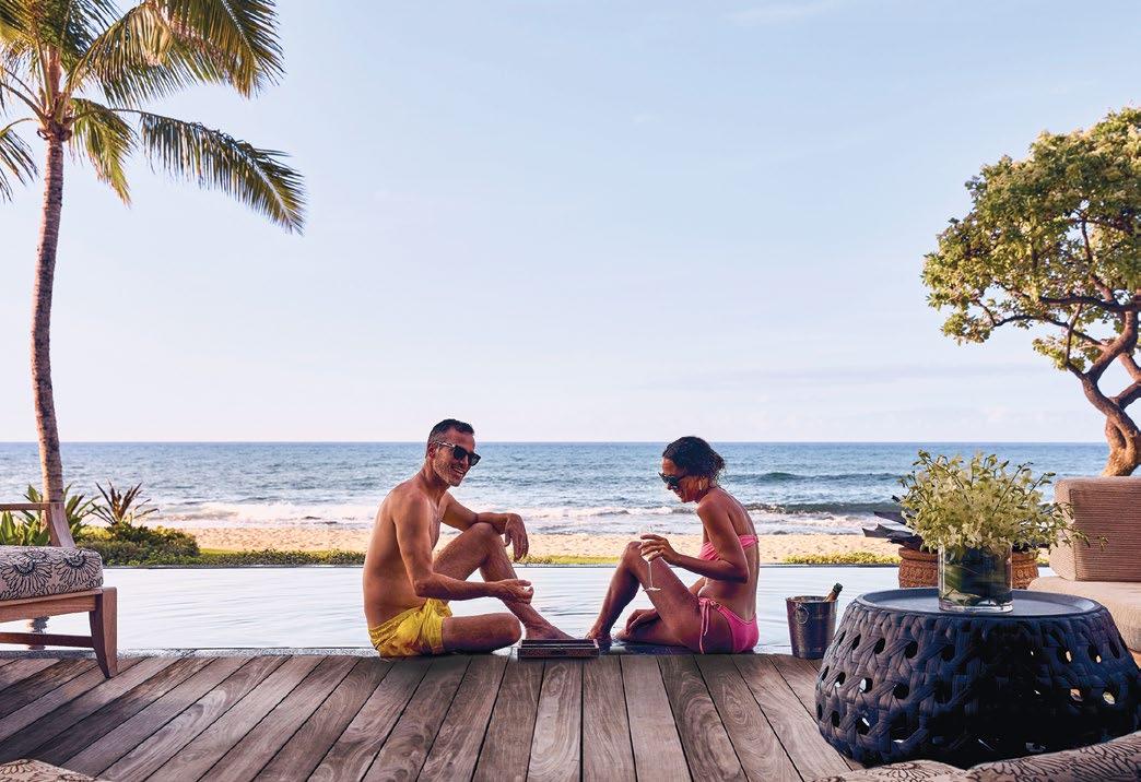 century-modern architecture, embellished with world-class art. Vintage surfboards, retro prints and the resident parrot add to the sense of old-school Hawaiian charm. Our airy Ocean Front Deluxe room had the perk of two lanais. At sunset, we each claimed a balcony to relish the beauty of the fading light over the horizon. We spent active days in the sun, either on a tennis court at the seaside facility, on the Robert Trent Jones Sr.-designed golf course or at the beachside Hau Tree bar. We found the food at the hotel’s signature ocean-view Manta restaurant to be fresh if not especially noteworthy. Considerably more memorable was our after-dinner stroll down to the manta ray observation deck. Floodlights over the water attract plankton, a favorite food of these graceful giants, which come to feed in balletic fashion.