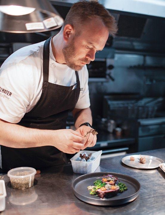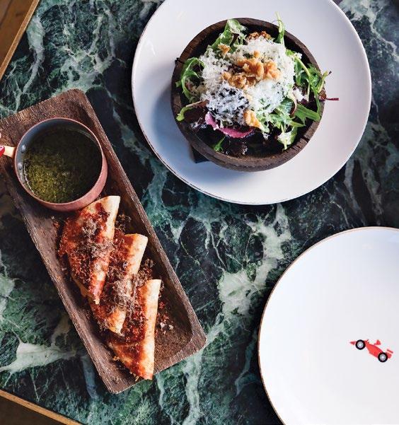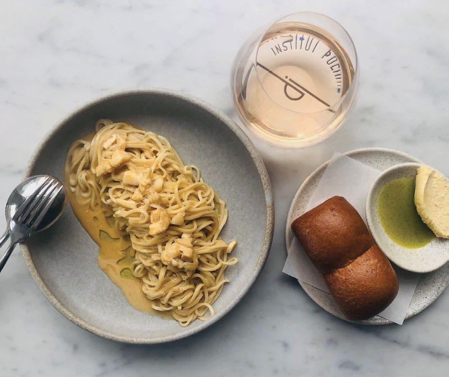 Named for the French polar research agency, Institut Polaire pays tribute to the island’s proximity to Antarctica. The restaurant is white on white, with marble surfaces and light fixtures mimicking ice. The service, however, is as warm as can be, under the leadership of co-owner Louise Radman. Her husband, Nav Singh, is a winemaker and distiller. I sipped his creations, starting with a locavore martini made with Süd Polaire Antarctic Dry Gin, distilled with Southern Ocean kombu and mountain-pepper berries. It was perfect alongside snacks like waygu tartare with wasabi mayo and whipped bottarga on thick toast. I greatly enjoyed light, bright dishes like scallop sashimi with lemoninfused verjus and a blanched heirloom tomato topped with tangy goat cheese