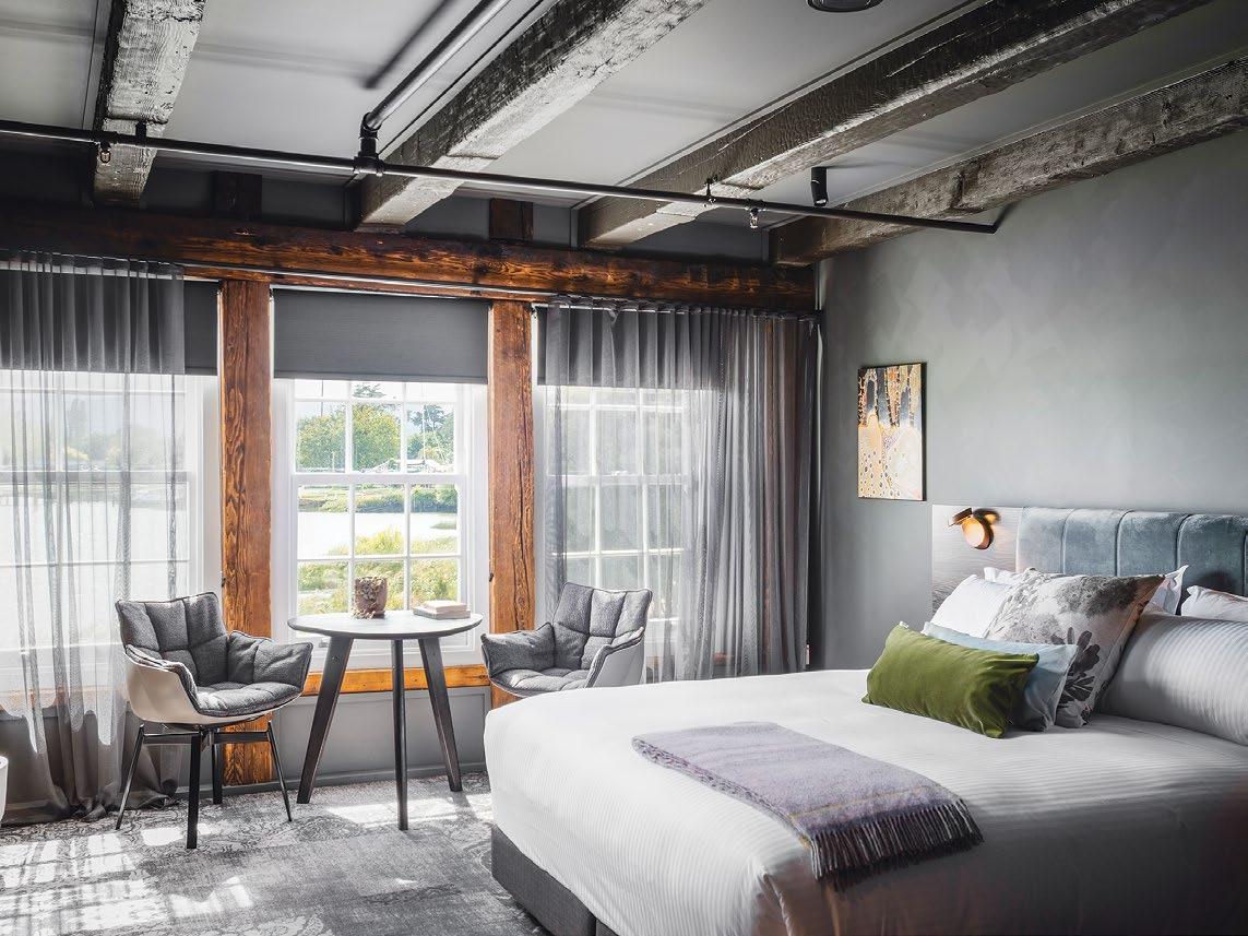 With its original wooden beams, midcentury-style furnishings and forest-green bath with an open shower, our 387-squarefoot Premium Suite had a sexy, denlike feel, further enhanced by a locally crafted armoire that contained an exceptional minibar. I sank into an armchair and, aided by the bird book on the café table, identified little black cormorants gliding by on the Tamar River just beyond the small parking lot.