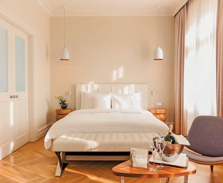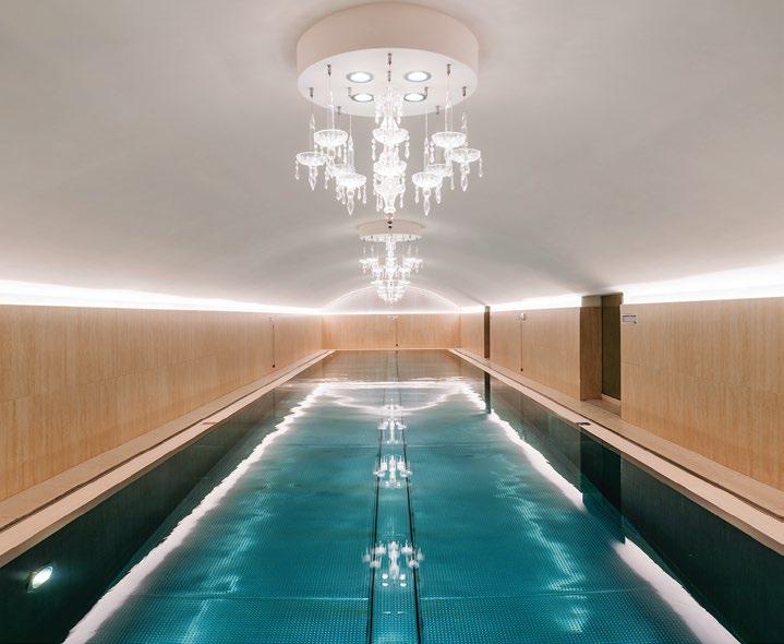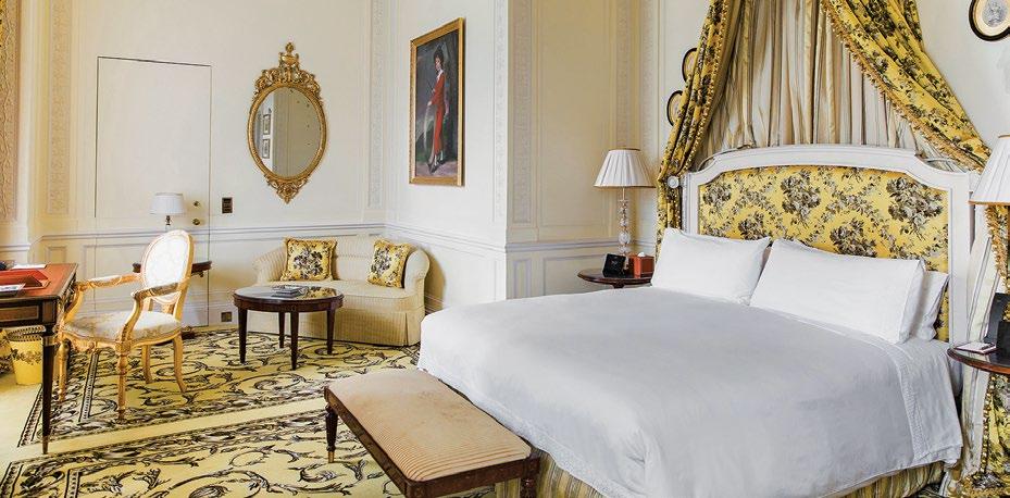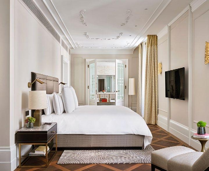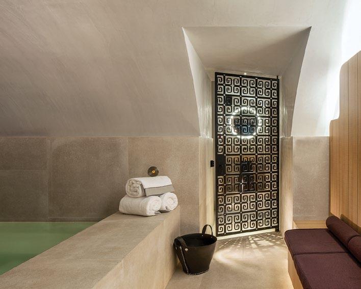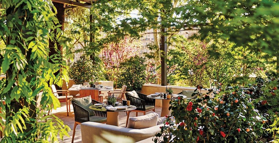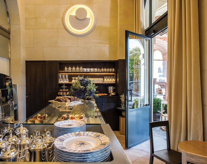 floors, all designed by Lecoadic & Scotto to elicit feelings of noble authenticity. The tranquility and serenity of the hotel’s Roman bath and in-room spa and skin treatments are a favorite of guests who prioritize wellness and relaxation. The freshly renovated ground floor leads to the tearoom and its breathtaking outdoor terrace, which welcomes guests under the covered walkway. They may enjoy light refreshments and taste the pastries of Yann Brys, Meilleur Ouvrier de France.