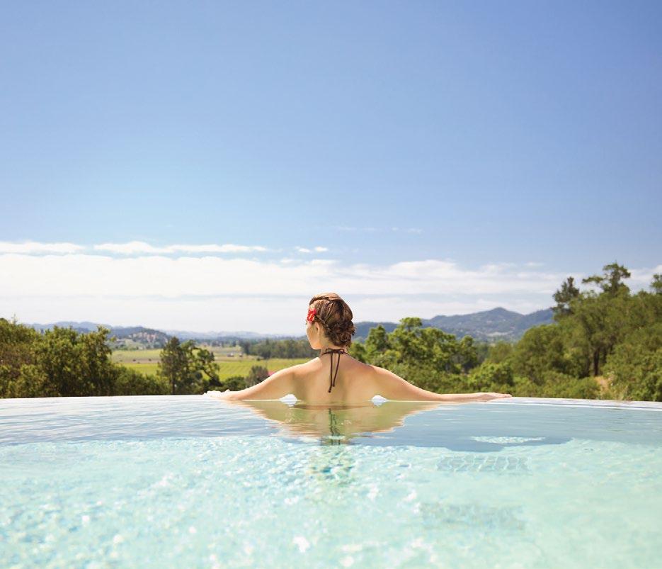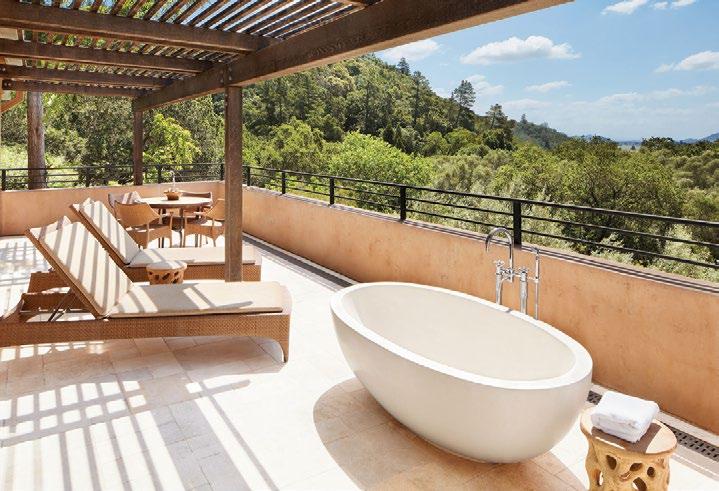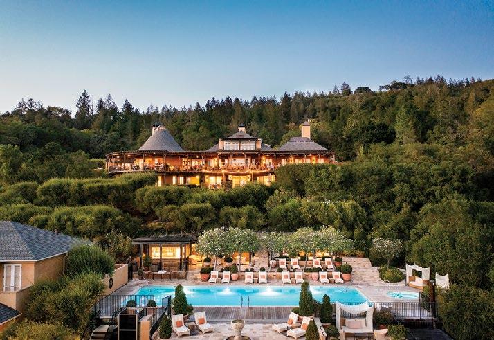 furnishings. Renowned for its culinary roots, the property offers a Michelin-star restaurant and bar, where guests enjoy fine dining and casual French-inspired fare while taking in the spectacular panoramic vineyard and valley views from the expansive outdoor terrace. The menu showcases seasonal ingredients and a 15,000-bottle international wine cellar. Additional amenities include The Spa, which offers wellness services, and Parc du Soleil, which has nature paths, picnic groves and a sculpture garden.