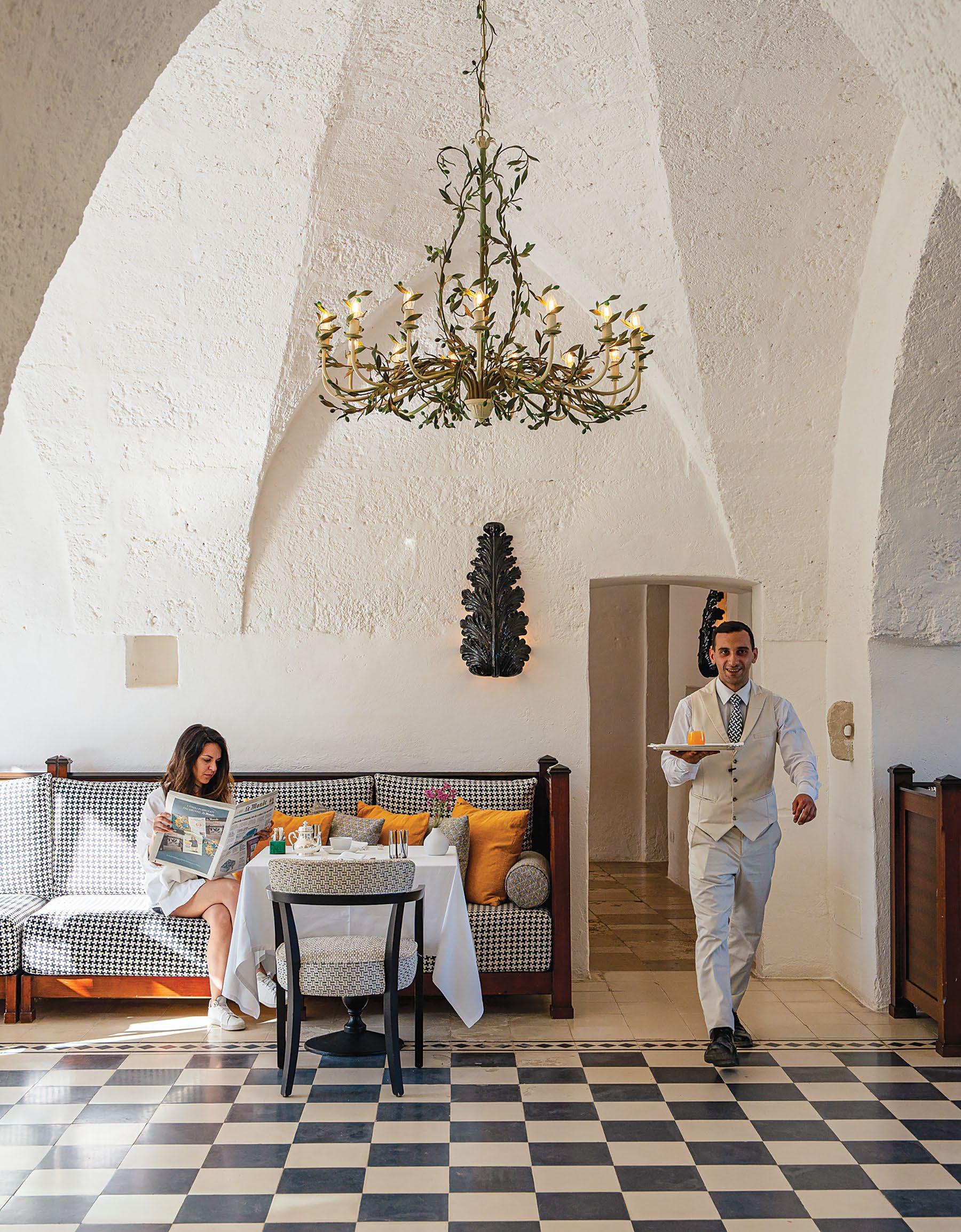 DINE For lunch, take a day trip to Polignano a Mare, a cinematic village on a rocky cliff overlooking the sea. The Travel Office can book a table at the famous Grotta Palazzese, a restaurant in a dramatic cave. Reserve far in advance for a table next to the sea, where you can spot swimmers and kayakers while you dine on a tasting menu of delicacies like lobster, truffles and caviar. Spend your evenings at the hotel, enjoying cocktails at the bar
