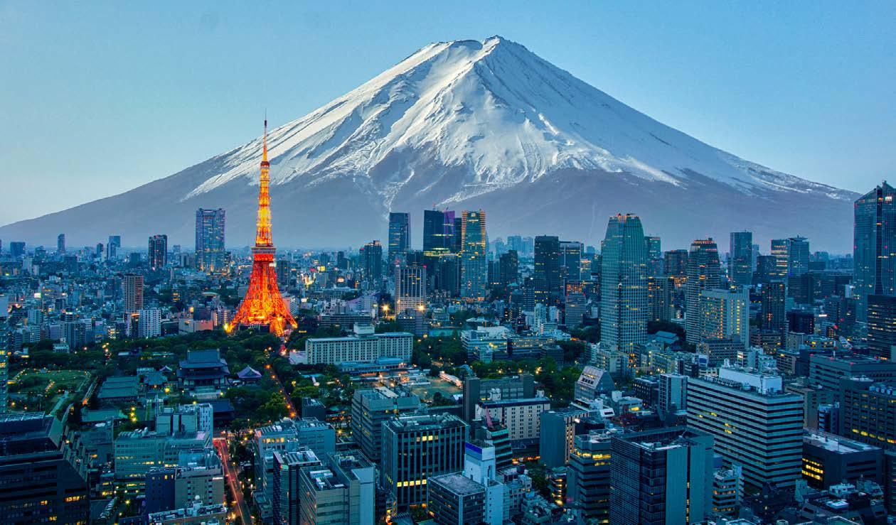 MOUNT FUJI SERVES AS A BREATHTAKING BACKDROP TO A MODERN CITYSCAPE