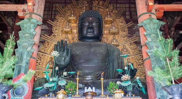 EXPLORE Then we’re off on a day trip to nearby Nara, first capital city of Japan (A.D. 710). Buddhism took hold here, and we can see its influence in sites around town. Visit Nandaimon, the Great South Gate, which leads us to Todai-ji, a temple complex in Nara-Koen Park. There is plenty to see, including the Daibatsu, an immense Buddha statue cast in A.D. 746.