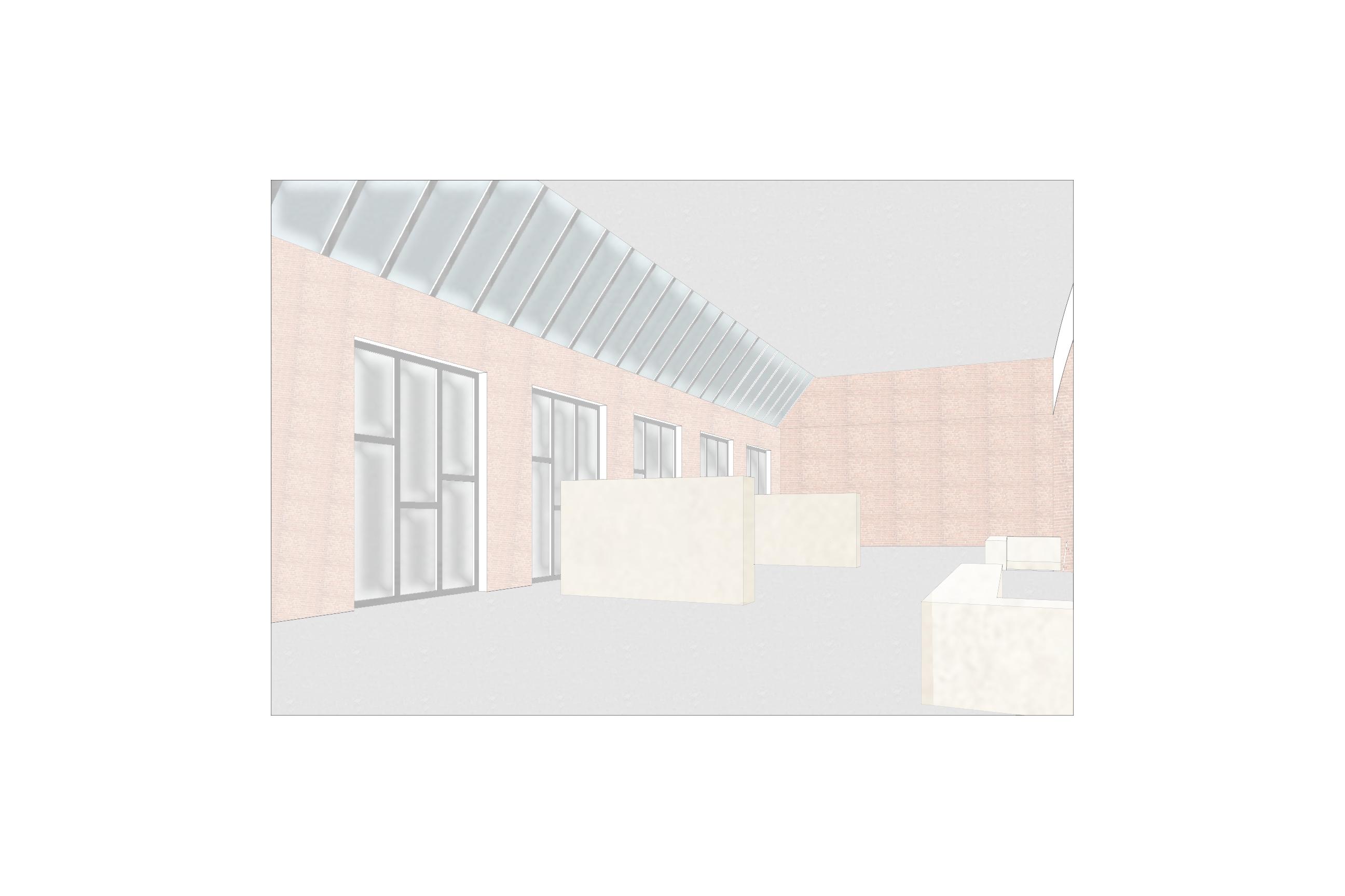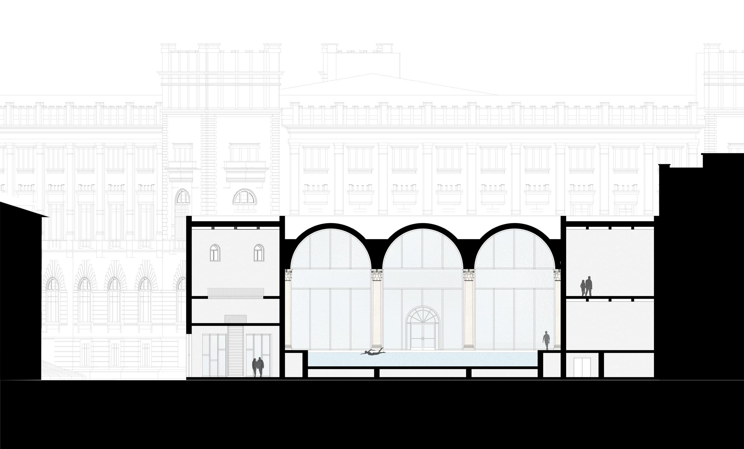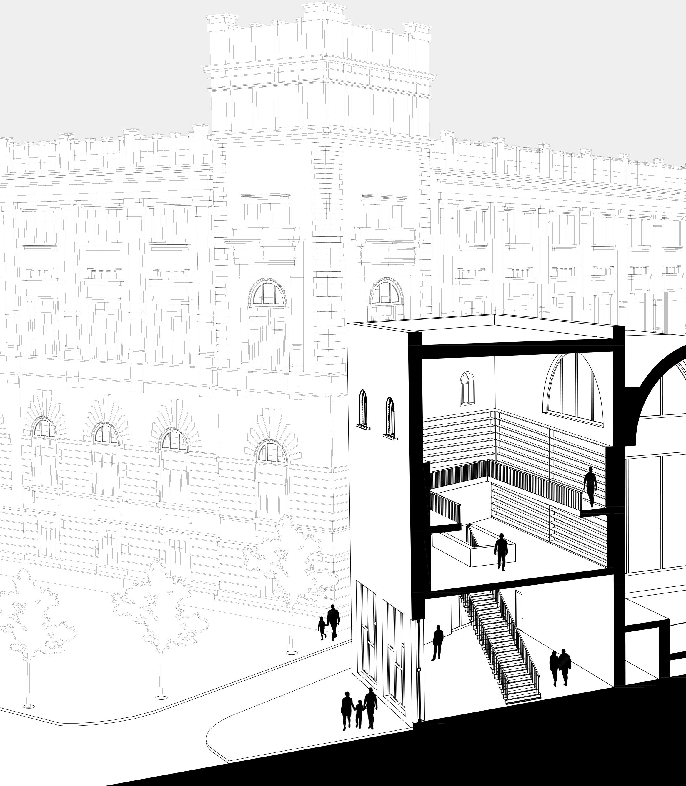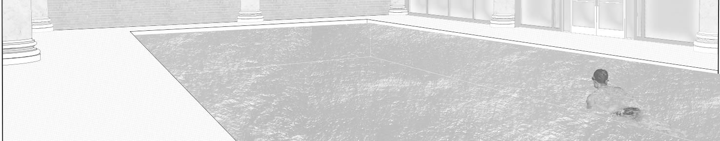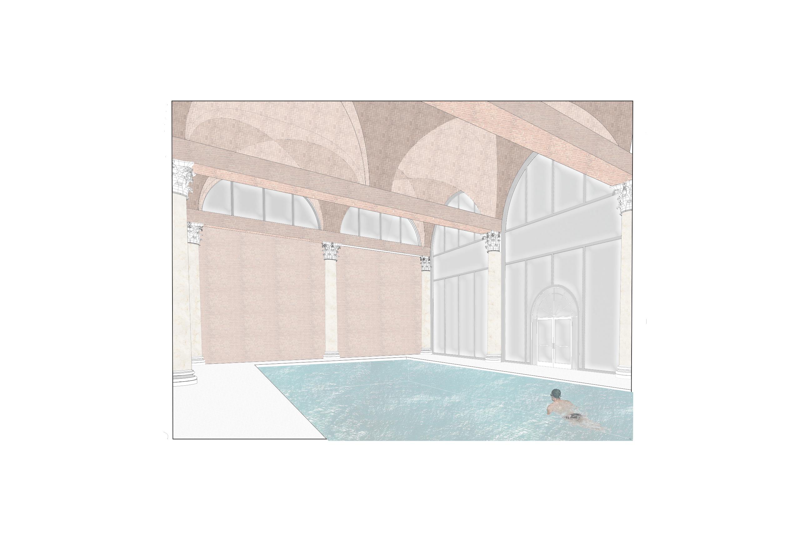 1. Exterior view of the bathhouse from the street view, showcasing the materials used and the green space visible. 2. Interior view of pool area, depicting the high groin vaulted ceilings along with corinthian columns. 3. Interior view of the proposed gym area, with angled ceiling windows allowing for light to shine in.