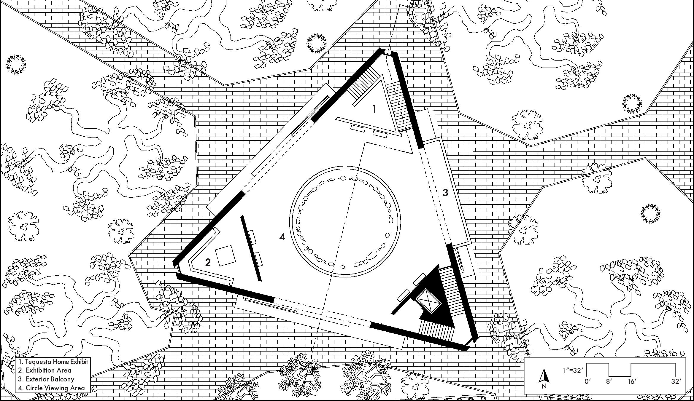 The new building, located within the main park acts as a museum to hold the artifacts found on the site. In here is where visitors can choose to learn about the history of the Tequesta people and the site. Since the Miami Circle is the exact size and site of the huts they lived in, it is reflected inside the museum to create the sense of space that the Tequesta People lived in. The Tequesta had a strong connection to the sky and because of this the exhibit inside the museum goes towards the sky and allows light to shine through skylights above. This unique feature along with the hundreds of artifacts found on the site serves the purpose of not only perserving the artifacts but the memory and history of these people thousands of years later.
