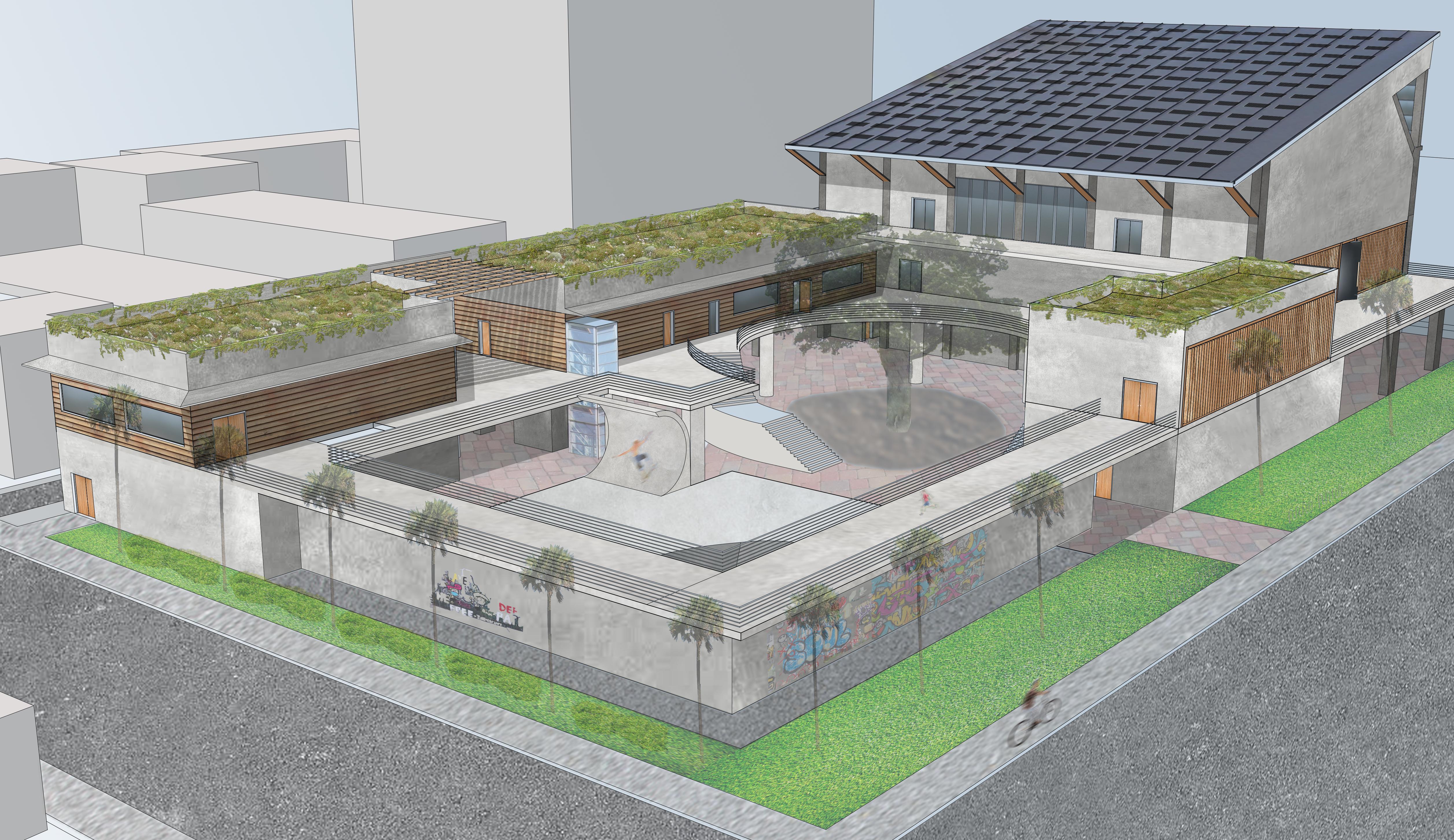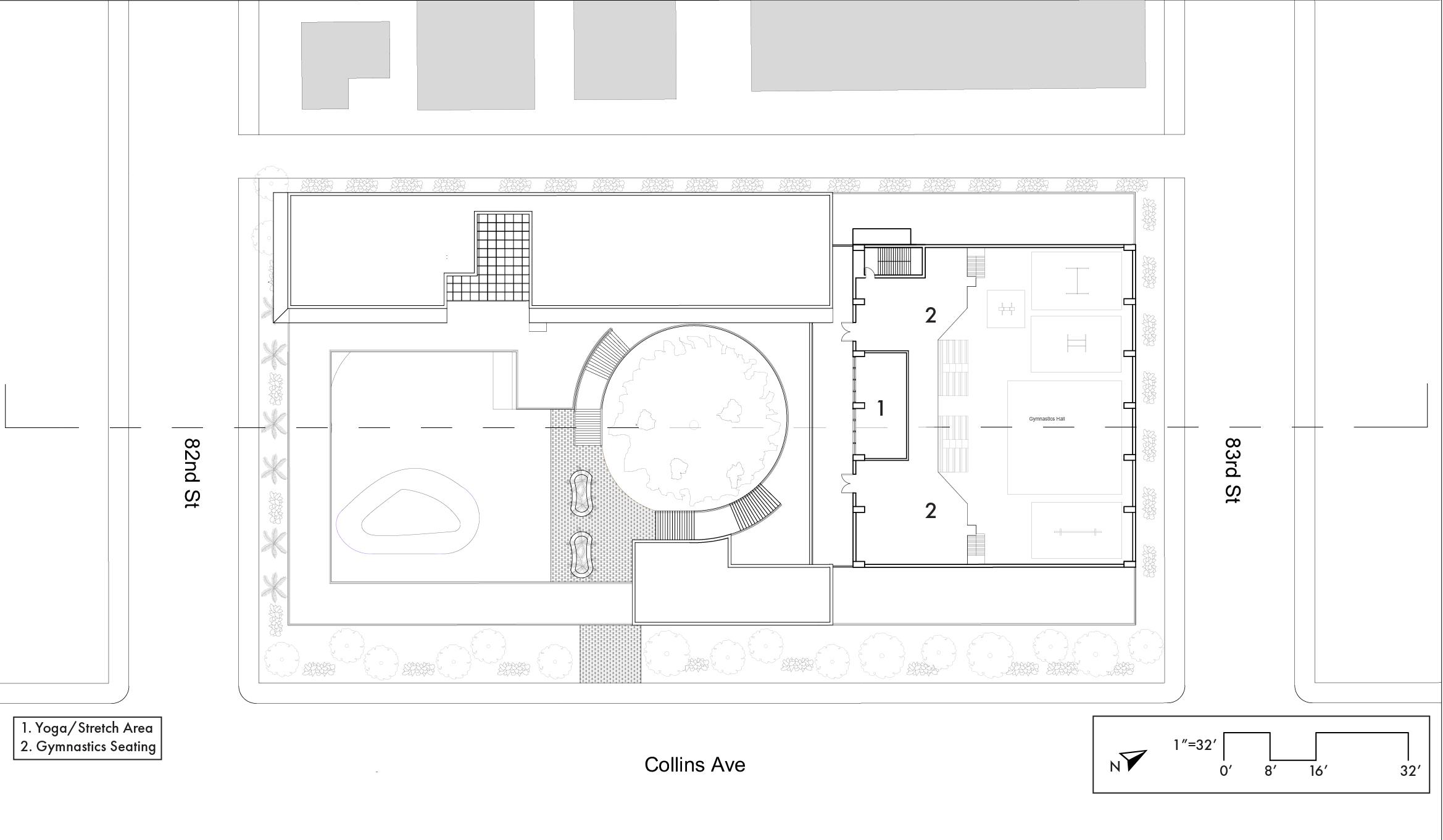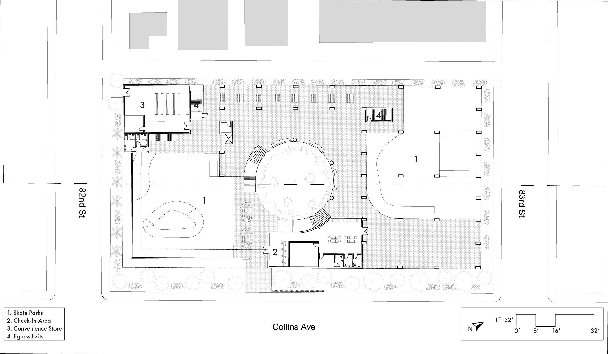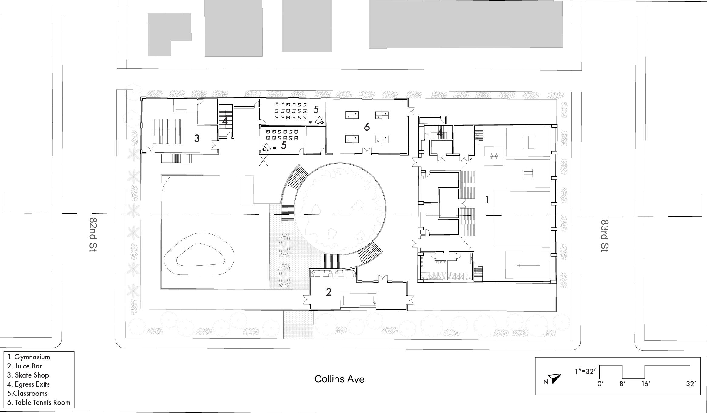 The youth center designed has a wide variety of entertainment, including interior and exterior, options. The exterior on the ground floor provides two separate areas that both are skate parks for the people of Miami, as well as, seated areas located around the property. The interior area has a main focus on the gymnastics gym, which is the largest area spanning two floors. Additionally, there is a check in area, classrooms, offices, table tennis area, a juice bar, a skate shop, and a convivence store. All these aspects of the program have been strategically placed throughout the building and provides easy access for everyone no matter what the purpose of their visit is.