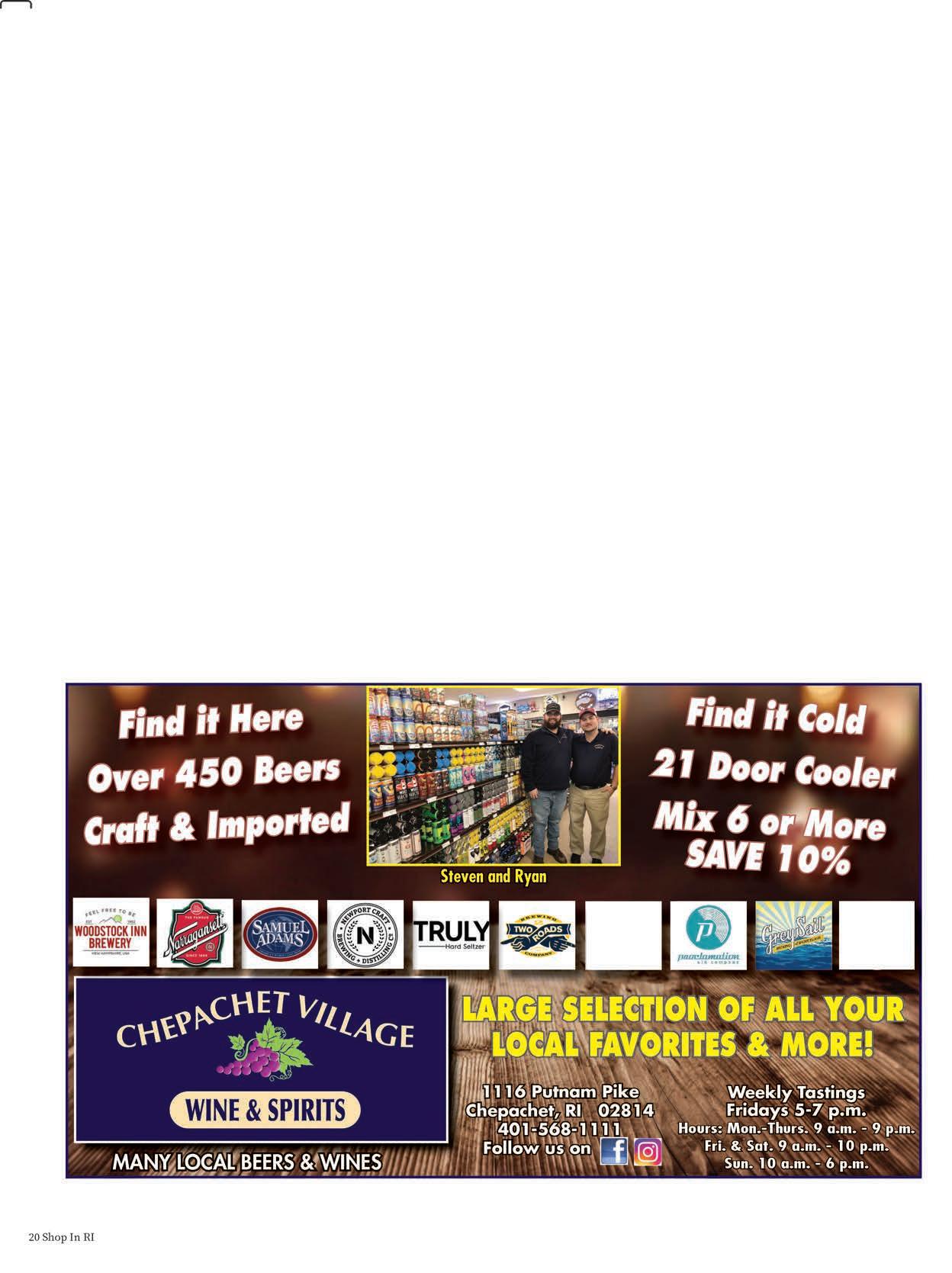 Thanksgiving | Hanukkah | New Year’s menu is available including our special Artichokes and Cannolis! AnthonysonFederalHill.com us before heading Year’s Eve Party! RESERVATIONS REQUIRED | CLOSED AT 10PM Year SHOP IN RI the Magazine 1525 Mineral Spring Avenue, North Providence, RI 02904 ph: 401.270.2832 fax: 401.353.0792 email: ShopInRI@ShopInRI.com Visit ShopInRI.com to view all current and past issues of Shop In RI magazine! 38-40 Cover Story 41 at Franklin Rogers 42-43 Savon Shoes Keeping Customers on Their Feet 44-47 Holiday Shopping on the East Side 52-53 The Matrullo Family Investing Decades Keeping Customers Smiling 56 Laurie Reilly’s Breast Cancer Journey 58-59 Yoga, Pilates & Meditation 60 Stacie Venagro Fitness Tips 64-65 Holiday Fun Activities For the Entire Family The Magical Leak 74-75 Claudia’s Creations at Mangiamo 76 12 Things You Didn’t Know State The Facts 80-81 Shang Bailey Hotel Johnston, RI 82 Ameriprise Financial Tips Planning for Inflation? 85 Whats Up With That Silly Laws 88-89 Troop Providence 94-95 Brew Grindz It’s A Whole New Taste 102-103 Christmas Dinner for the Homeless Charming Treasures / Charmed and Dangerous December 2019 52 80 32 4 Travel Tips 5 Front Page 6 National News 7 World News 9 RIHA - Regaining Consumer Confidence 10-11 Sunny Side On The Street 12 Live The Live Recipe 14-15 Entertaining Events in April 18-19 Satisfying Recipes 20 12 Things You Didn’t Know 22-23 Style Profile 24-25 Blooming Blossoms 28-29 Self Serenity Wellness Spa 30 Stacie Venagro Fitness Tips 32-33 It’s My Health 36-37 A New You! 38-39 RI Vaccine Updates 40-42 Ameriprise Financial Tips 44-45 Leading By Example 48-49 Dare to Dream Ranch 50-51 Cover Story Certa Pro of Northern RI 54-55 Time Zone 59 Silly Laws State The Facts 62-63 Custom Stars and Stripes By Tom Jones 66-67 Furs Fins and Feathers 71 Ask An Expert 72 What’s Up With That 74-75 Southern Rhode Island Chamber of Commerce 78 Toyota of Smithfield Expanding Staff 80-81 E2G Sports Editor Anthony Manzo Executive Editor Jeffrey Manzo Chief Operating Officer Jim Lombari President & Creative Director Michael McDonald Managing Editor David Patricio Vice President Brian Kelly Board Members Dr. Paul Matrullo Dr. Joseph Matrullo Michael Mota Contributors Jen Wallace Al Matthews Stacie Venagro Tom Lopatosky Andrew Irby Writers Mark Berger Brian Lowney Julia Romano Jennifer Coates L.A. Reilly Jenn Lombari Susan Gazerro Sales Executives Jeffrey Manzo Jim Lombari Jenn Lombari Michael Belsito Photographers Guillermo Garcia Allyson Barth Michael Belsito the magazine Shop In RI 9 28 22 48 features: 4 Travel Tips 5 Front Page 6 World News 7 National News 10-11 Summer Hot Spots 13 RIHA Monthly Column 16-17 Watermelon Recipes 18-19 44th Annual St. Anthony’s Feast 22 No Offseason For Fitness 24 Becoming Comfortable At The Gym 24 Dynamic Thoughts 26-27 Susan Gazerro Fitness Tips 32-33 Christmas In July at Anthony’s Jewelers 35-37 Summer Food, Folk & Jazz Fesitvals 38-39 Big Brothers & Sisters of RI 42-43 Best RI State Parks 44 & 46 Ameriprise Financial Tips 48-49 Julie Ochs Realtor 52-53 Christopher Medeiros Gorra Financial 55 Ask An Expert 58-59 Kindred Women Travelers 62-63 Destination RI 68 12 Things You Didn’t Know 68 What’s Up With That 69 Satisfaction Is Key At Toyota of Smithfield 72-73 Why You Should Market Your Company Editor Anthony Manzo Executive Editor Jeffrey Manzo Chief Operating Officer Jim Lombari President & Creative Director Michael McDonald Managing Editor David Patricio Vice President Brian Kelly Board Members Dr. Paul Matrullo Dr. Joseph Matrullo Michael Mota Contributors Jen Wallace Al Matthews Stacie Venagro Tom Lopatosky Andrew Irby Writers Mark Berger Brian Lowney Julia Romano Jennifer Coates L.A. Reilly Jenn Lombari Susan Gazerro Paul Lonardo Paul Ignasher Sales Executives Jeffrey Manzo Jim Lombari Jenn Lombari Michael Belsito Camilla Spliid Photographers Guillermo Garcia Owen Head Michael Belsito July 2023 16 29 35 38 42 48 58 62 Shop In RI 3