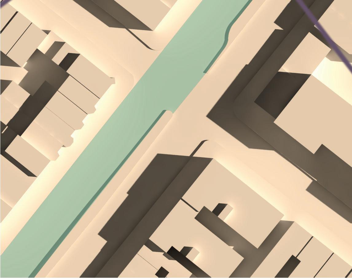 Urban commercial districts in all cities face usage crises due to accelerating changes in work-life patterns. Simultaneously, New York City and the country face a housing crisis due to a lack of (particularly affordable) housing. The reemergence of historical disparate employment lifestyles mirrors the process of daylighting entombed urban streams. Similarly, repositioning unwieldy later 20th-century office towers into homes requires, among other factors, bringing daylight farther into deep floor plates. Fractal textural subtraction derived from the city’s 1916 Zoning Resolution carves away from both aging facades and dead streetscapes. Reintroducing livability vertically and horizontally engages ecologic groups across a reanimated Manahatta biosphere: a contact zone between previously divided human and non-human inhabitants.
