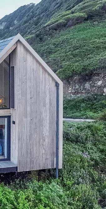 cladding and plastered masonry facades, with the roof tiles accounting for 80% of the façade covering. Guttering is in aluminium and is concealed so as not to spoil the seamless flow of the Shingle tiles from roof to wall façade.