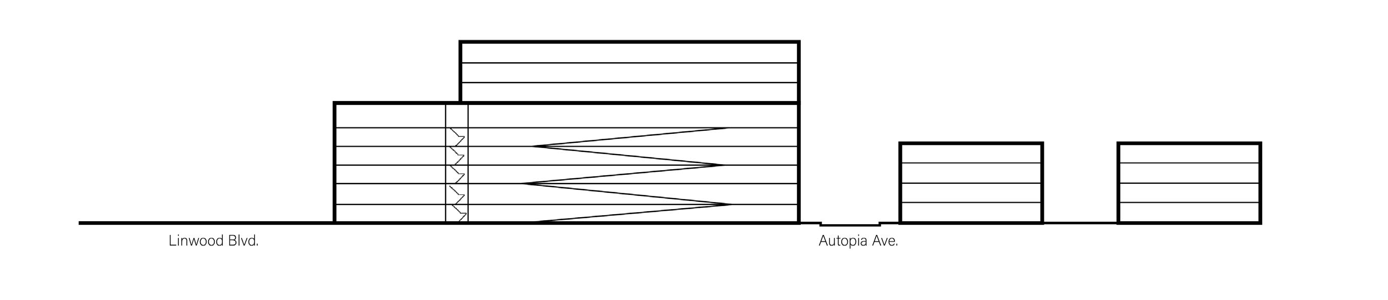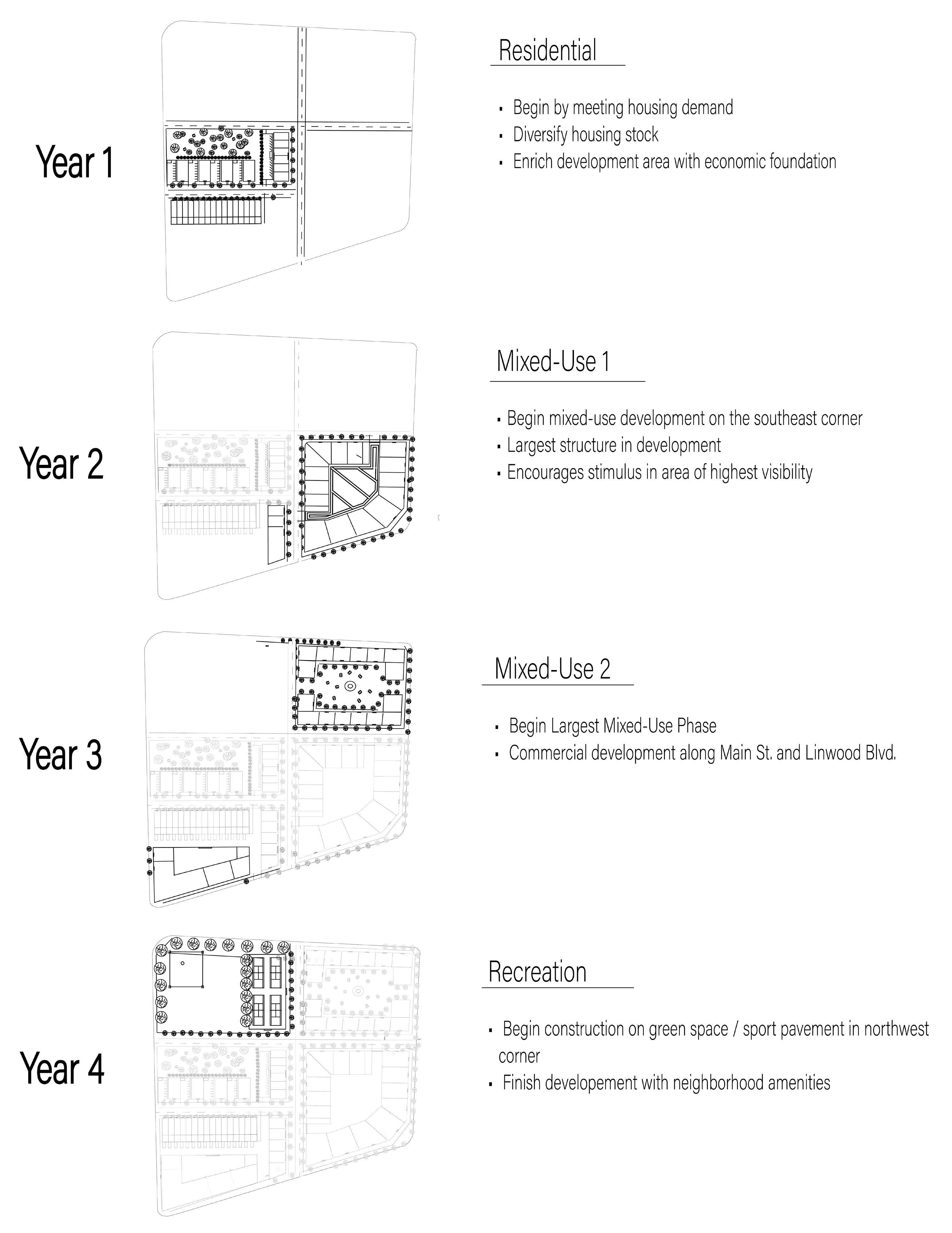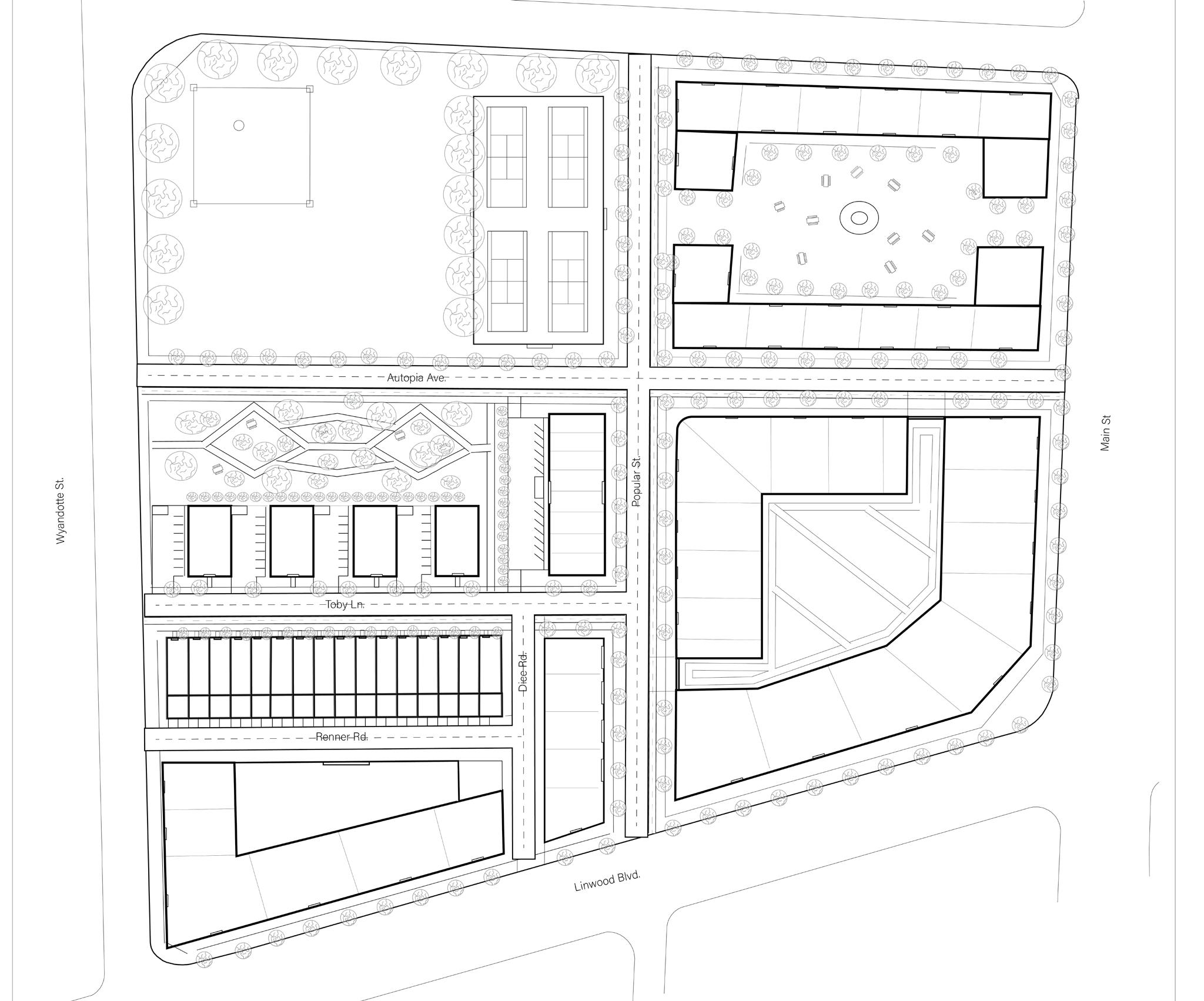 This work is a response to a proposed streetcar expansion on two intersecting arterial roads in Kansas City. The expansion includes a lengthened north-south route on Main St, along with a new east-west route along Linwood Blvd. The northwest corner of this intersection is currently occupied by several large, low density facilities.