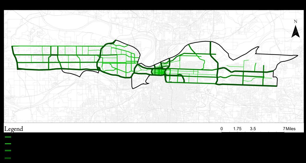 This graphic displays the AADT of major and some minor arterial roads. K-DOT and MO-DOT data was used to identify relevant roads. AADT volume lines were manually created using Adobe Illustrator with an imported GIS boundaries map.