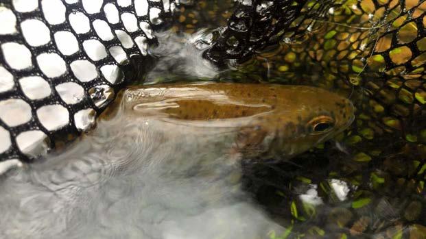 Craig Bolch was fishing a red buzzer and a stick caddis underneath an indicator. He had a take and he could see it was a large fish by the swell and tail coming out of the water. Then he remembered he had a 5X tippet and then thought he had to play this fish. He kept in contact with the fish knowing that he would exhaust it before attempting to bring it in. As he got it closer to the net it took off once again and once more he careful applied pressure. Eventually he had it near the net and thought if this fish has a final run it may break the tippet. An early one from Corey McNeight