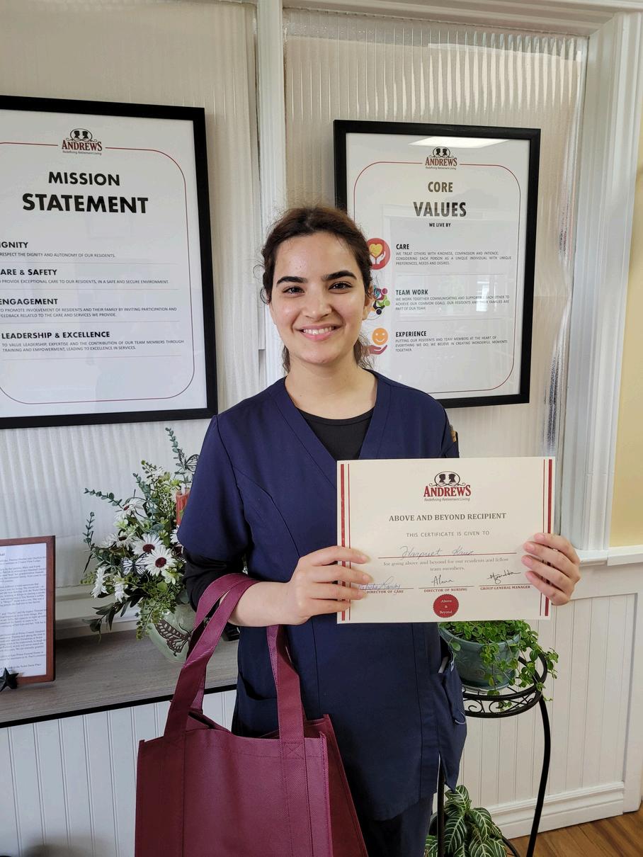 Prior to joining Andrews, she worked in longterm care at a public home. When her role changed, requiring her to no longer be on the floor, she decided to look for work elsewhere. A friend recommended Andrews and the rest is history