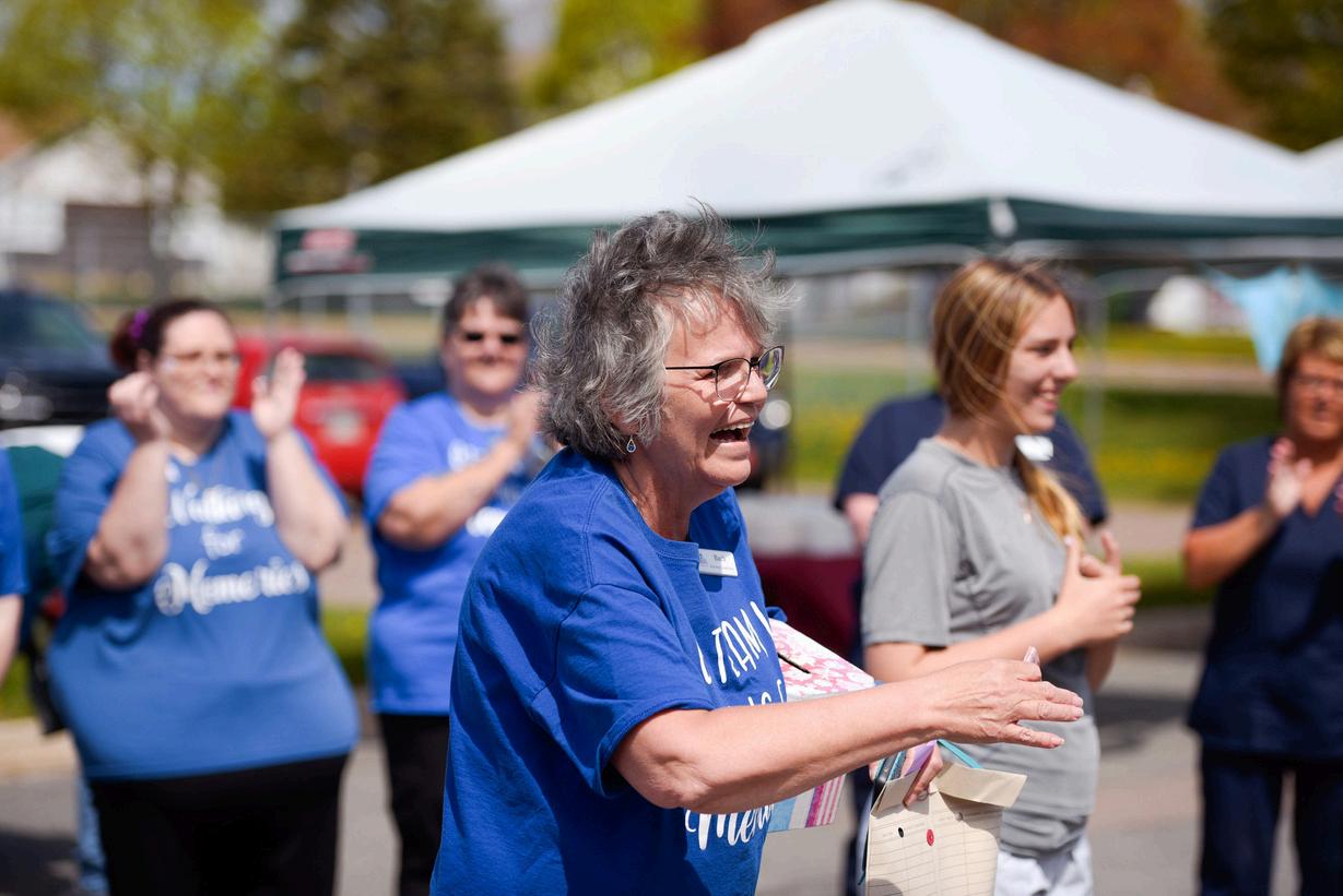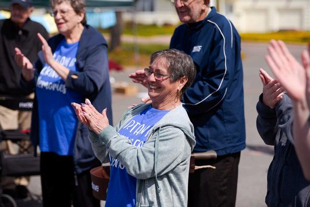 Barb Pye, Andrews of Parkhill activity director, leads residents and team members during the home’s annual Alzheimer’s fundraising walk on May 21, 2024.