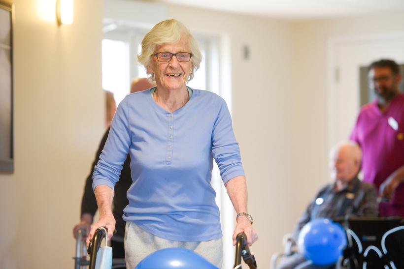 Andrews of Stratford resident Evelyn Rafuse makes her way down the hall during Stratford's in-house fundraiser walk.