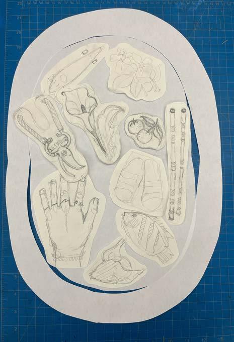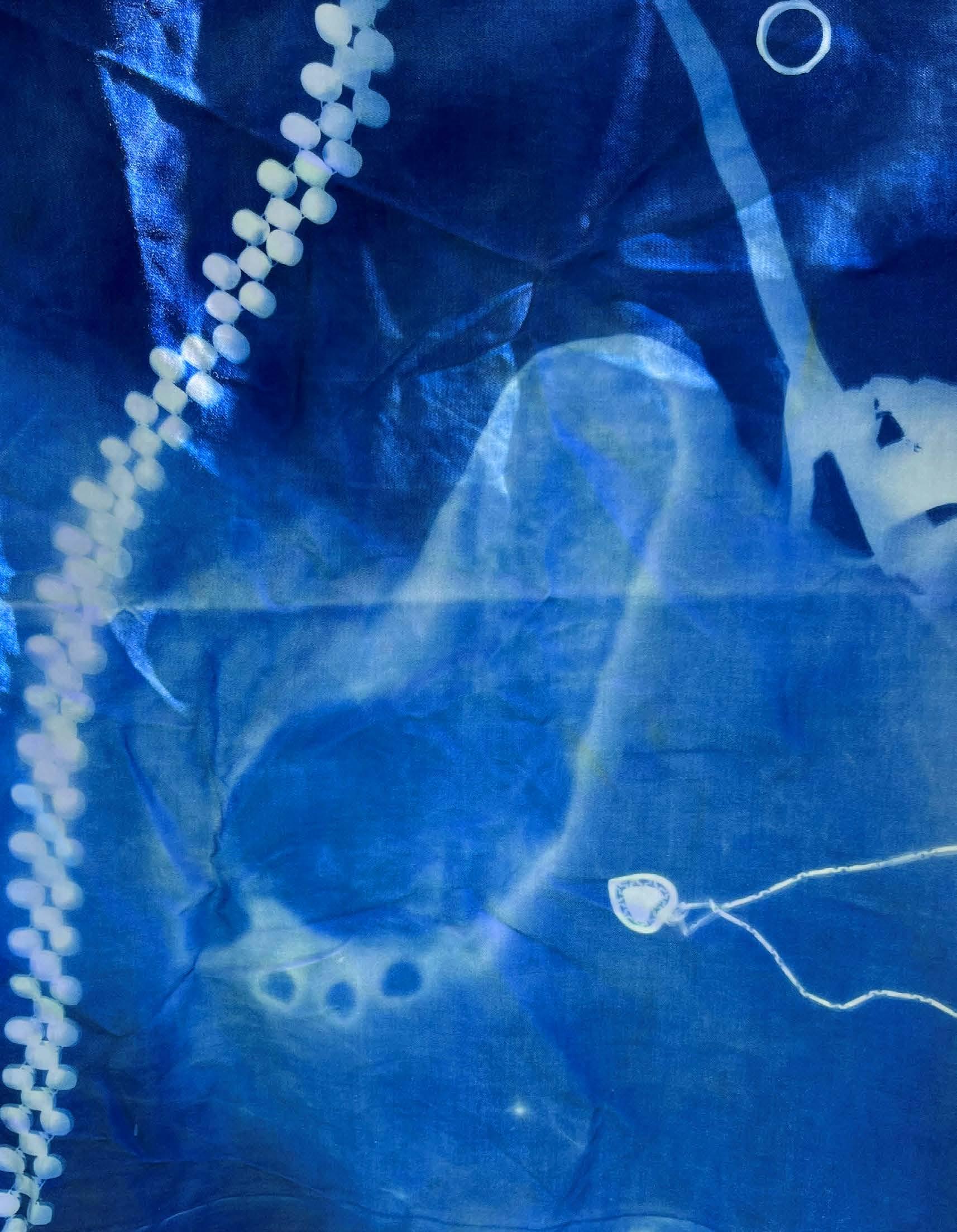 Plants and personal objects are placed onto the fabric. What is exposed to UV will react to form a deep blue; what is obscured will remain white.