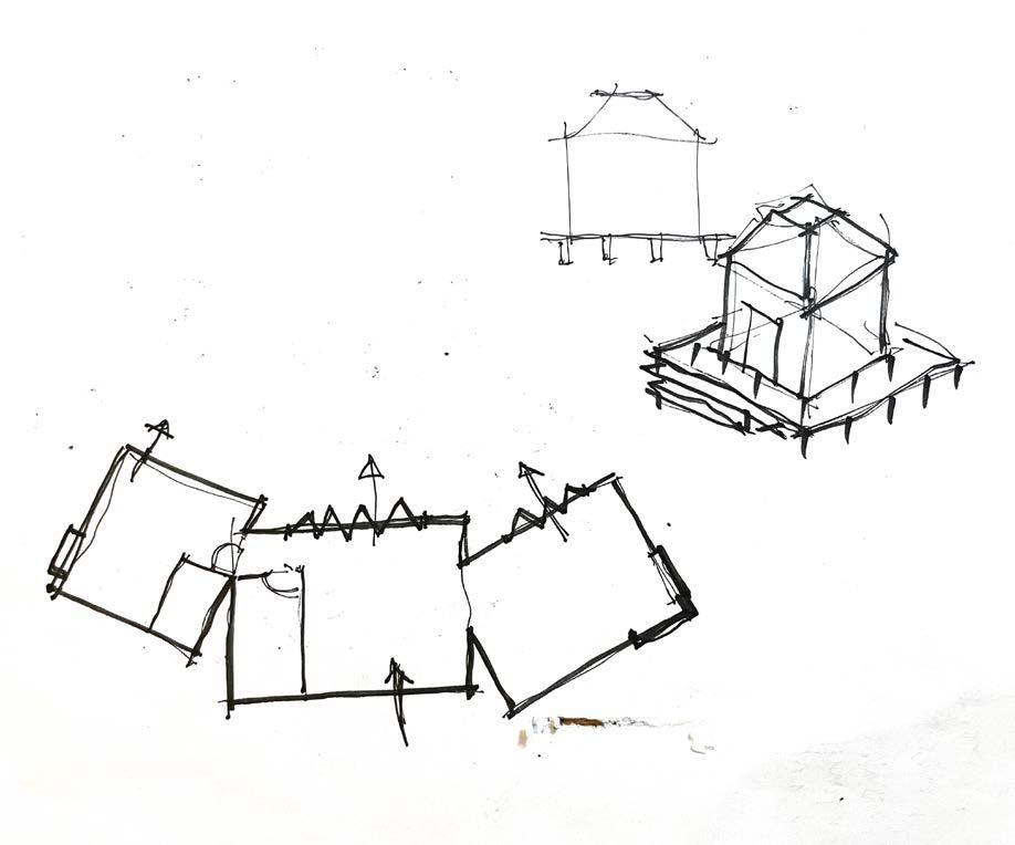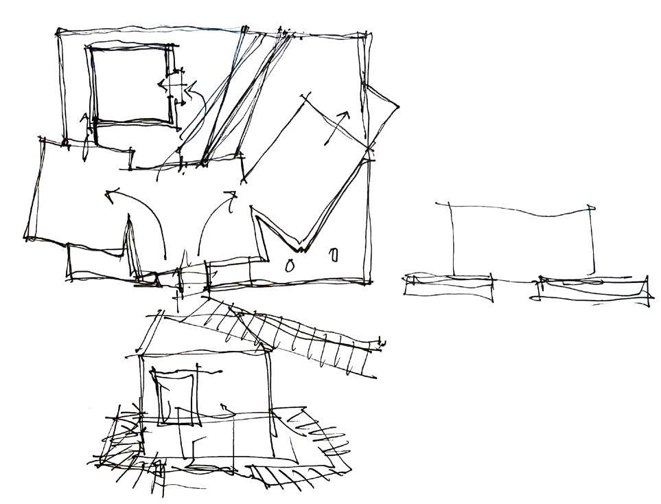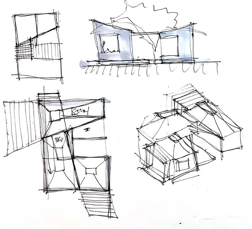 Initial sketches show an early interest in a “village in the forest” concept. Living, sleep, and kitchen/dining comprise the main volume. A separated office helps compartmentlaize work and life. When rectangular forms are rotated off-kilter and intersected, they create interesting dialogue between the house’s competing functions: a place of work, and a place of rest.