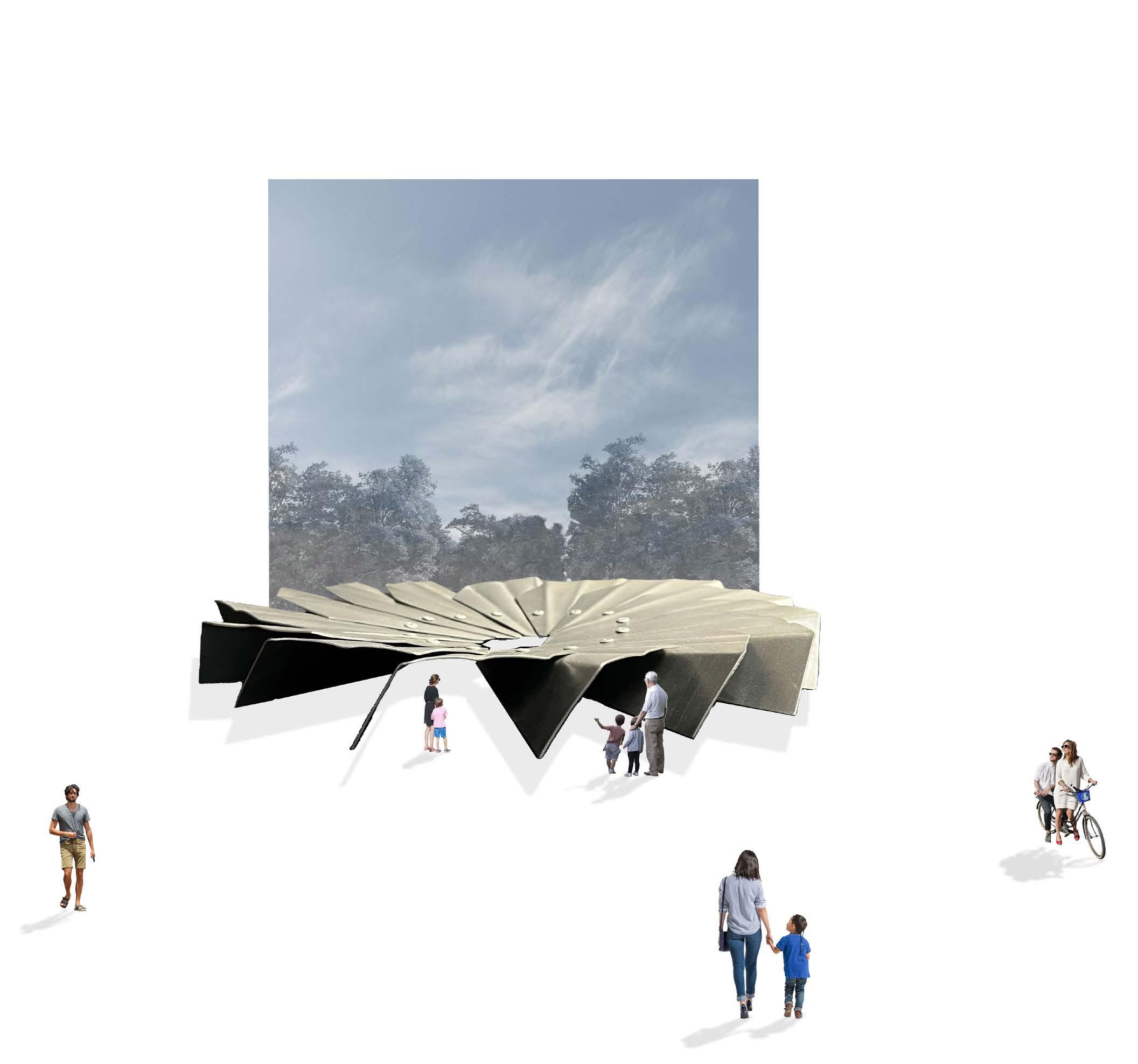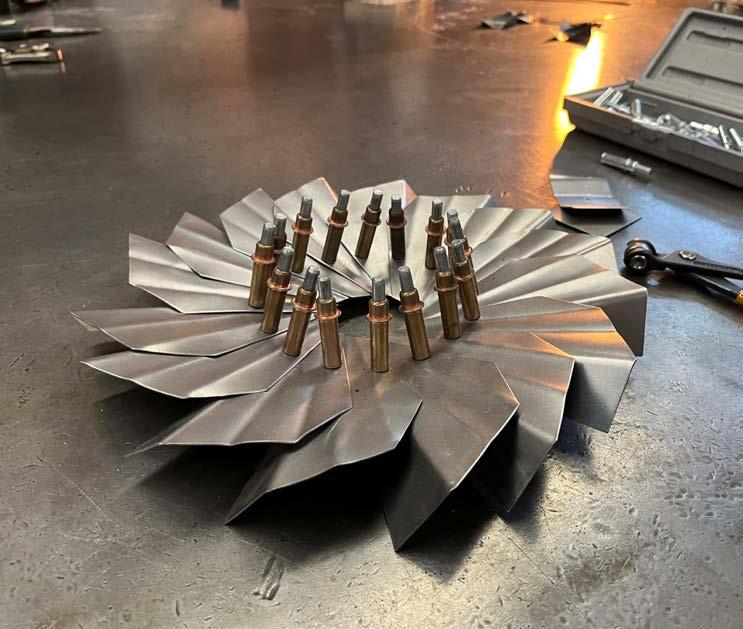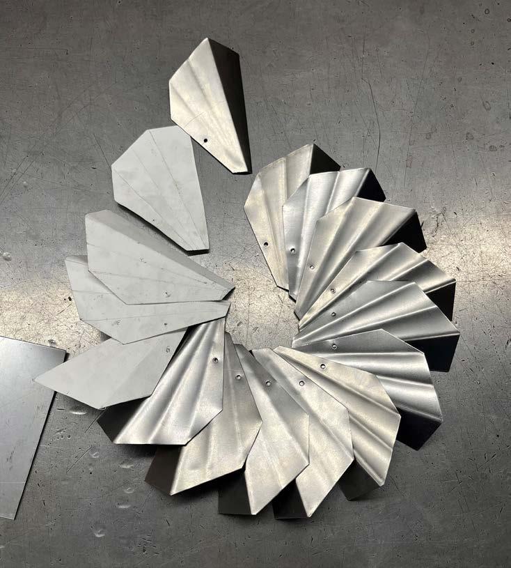 The deliverable is a pinwheel structure composed of cut, bent, and scallopped subparts. A 5” x 5” plate of galvanized steel is scored with a scribe, folded at discrete invtervals with a finger brake, cut with a cornernotcher. Scallop geometry was achieved by folding sheets at 45 degree increments and carefully reflattening with the finger brake, which retained the crease. Pieces are fastned together with rivets and finished via bead blasting.