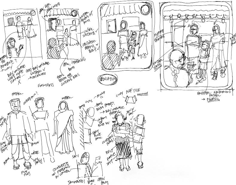 It was impotant to me that my illustrations were well informed by the culutral context of rural India. To develop a responsible visual vocabulary for this assignment, attended urban sketching meets, sutdiend Inidan art at museums, and consulted with mumbers of rural communities thoruhgout the design processs.
