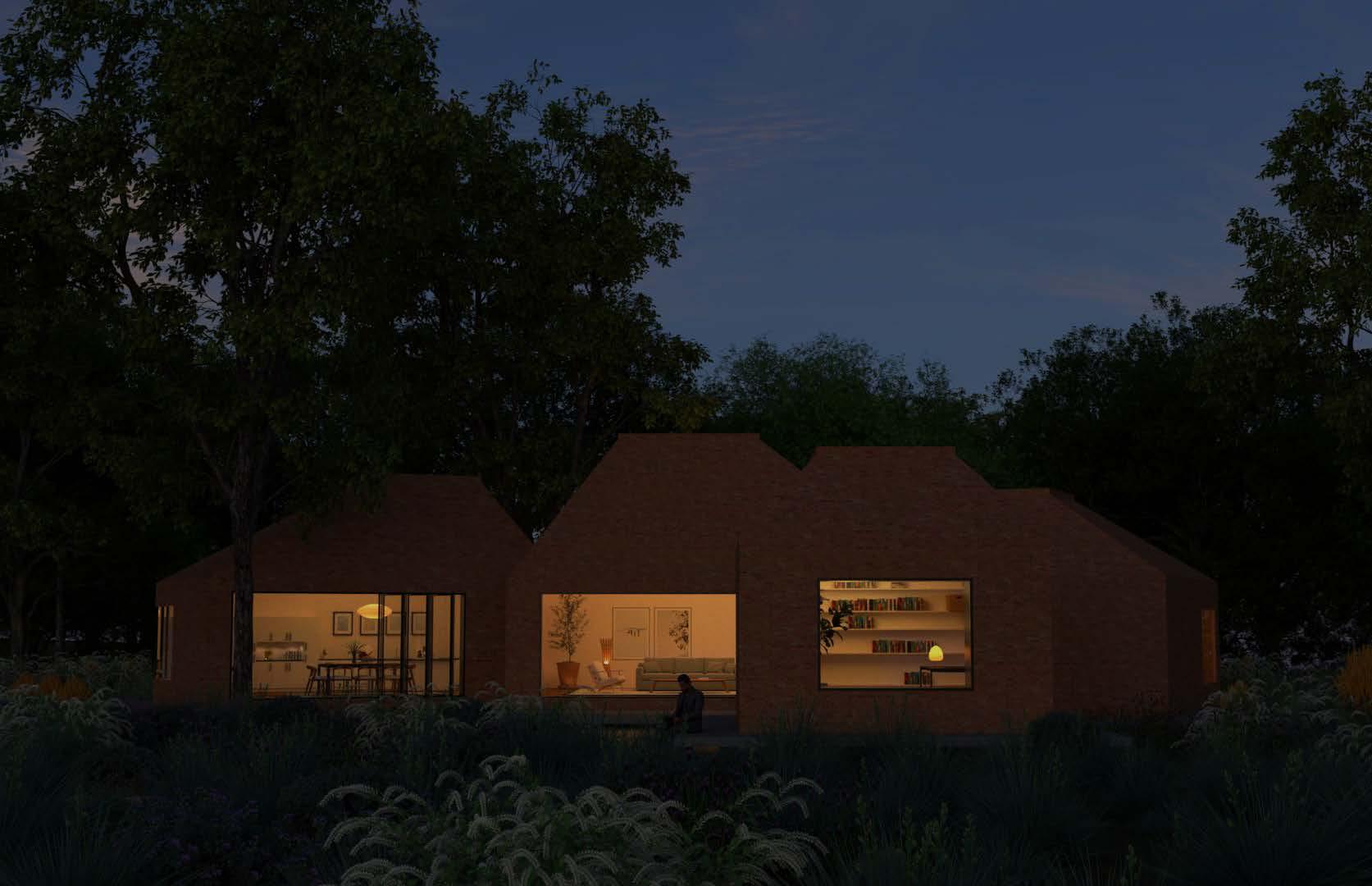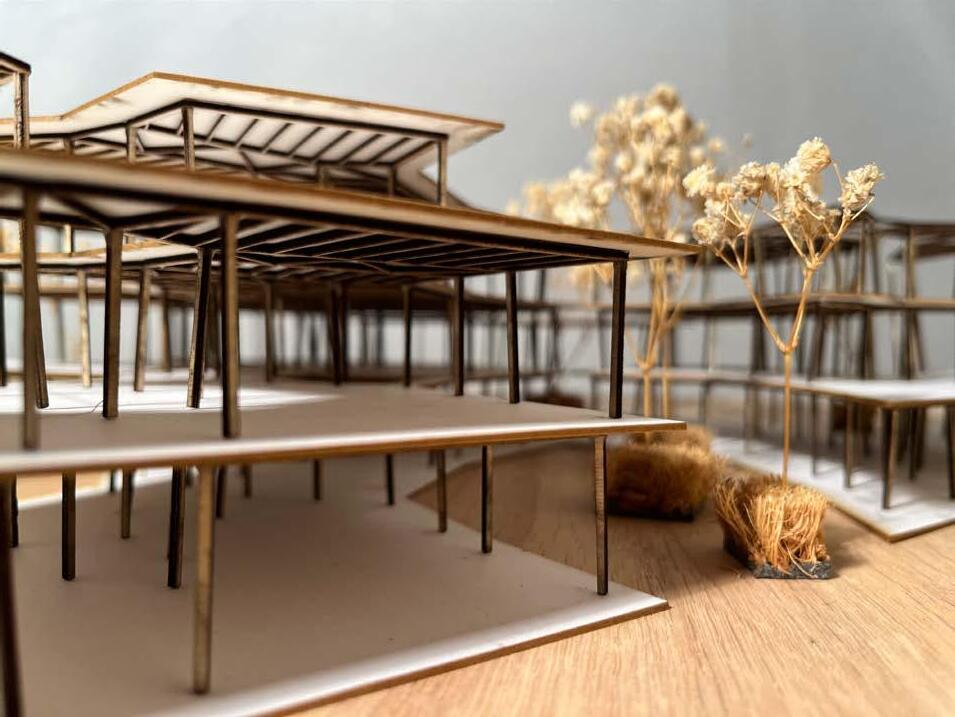 With the design intent, forms are elevated slightly to evoke the feeling of levity- to sit softly on the landscape. Notably, a separation of work and living was explored programmatically thorugh the division of sleep, cooking, and living quarters from an sequestered office.