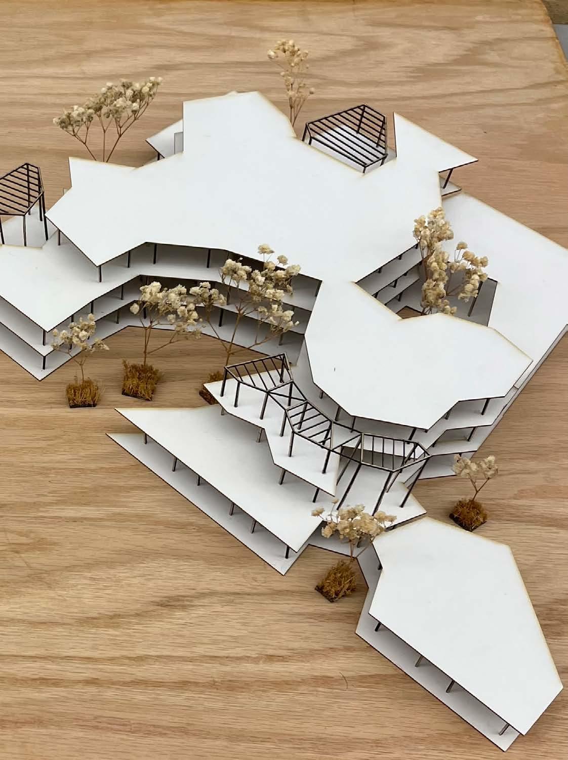 We address these parameters by laying a Voronoi pattern onto our site- nature’s efficient solution to colonizing space, seen everywhere from leaf veins to to giraffe spots. The Voronoi’s unique geometry solves several architectural/ engineering concerns: voronoi cells capture live oaks, becoming void space; interstitial “seams” become interior/exterior circulation paths; vertexes at pentagonal cells become structural system.