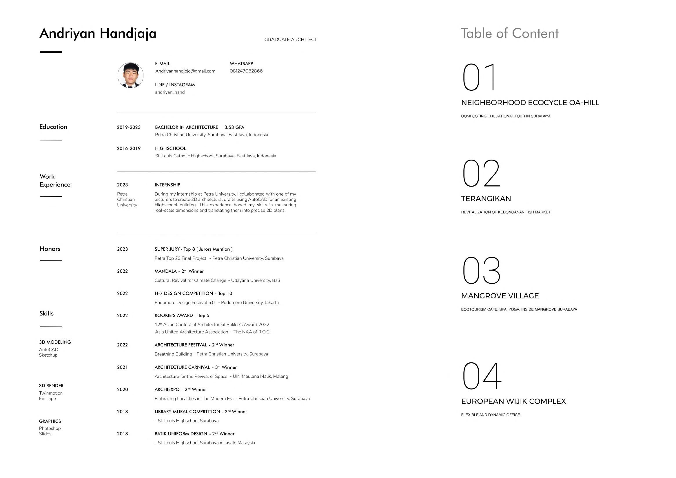 Within these pages, you'll find a collection of my best projects, designs, and concepts. Each project reflects not only my technical proficiency but also my innovative thinking, attention to detail, and commitment to sustainable and functional design. Through my portfolio, I aim to convey the essence of my architectural journey, from conceptualization to execution.