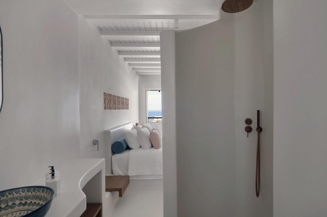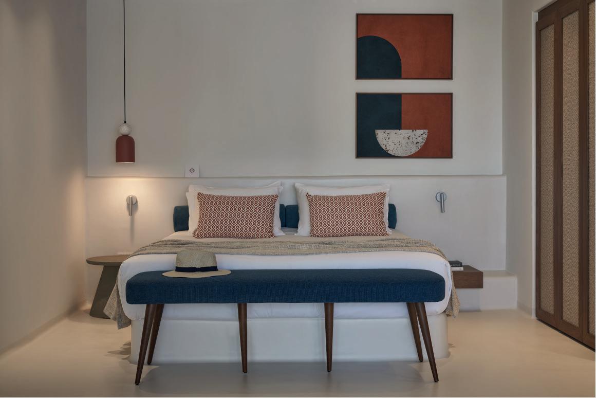 The Essence Suites with Sea View and Private Pool offer a perfect retreat for families or friends, featuring a bedroom with a Cycladic-style King Bed, a spacious living room with a sofa bed, refrigerator, and coffee corner. The suite includes a well-appointed bathroom and two large verandas, providing stunning sea views and a refreshing breeze. Ideal for creating lasting memories in a beautiful setting.