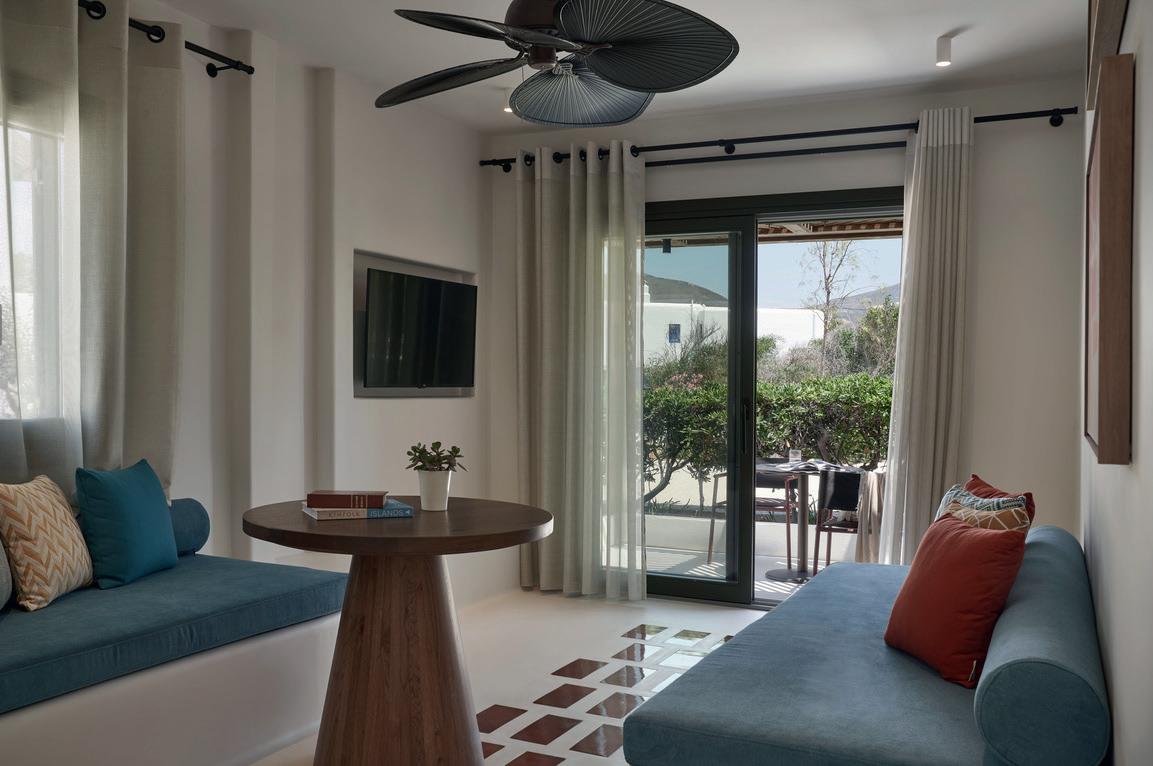 The Deluxe Suites are ideal for families or friends, offering garden views and two bedrooms with traditional Cycladic-style King Beds. The spacious living room includes a sofa bed, refrigerator, and coffee corner. With two bathrooms and expansive front and back verandas, these suites provide comfort, convenience, and a relaxing atmosphere.
