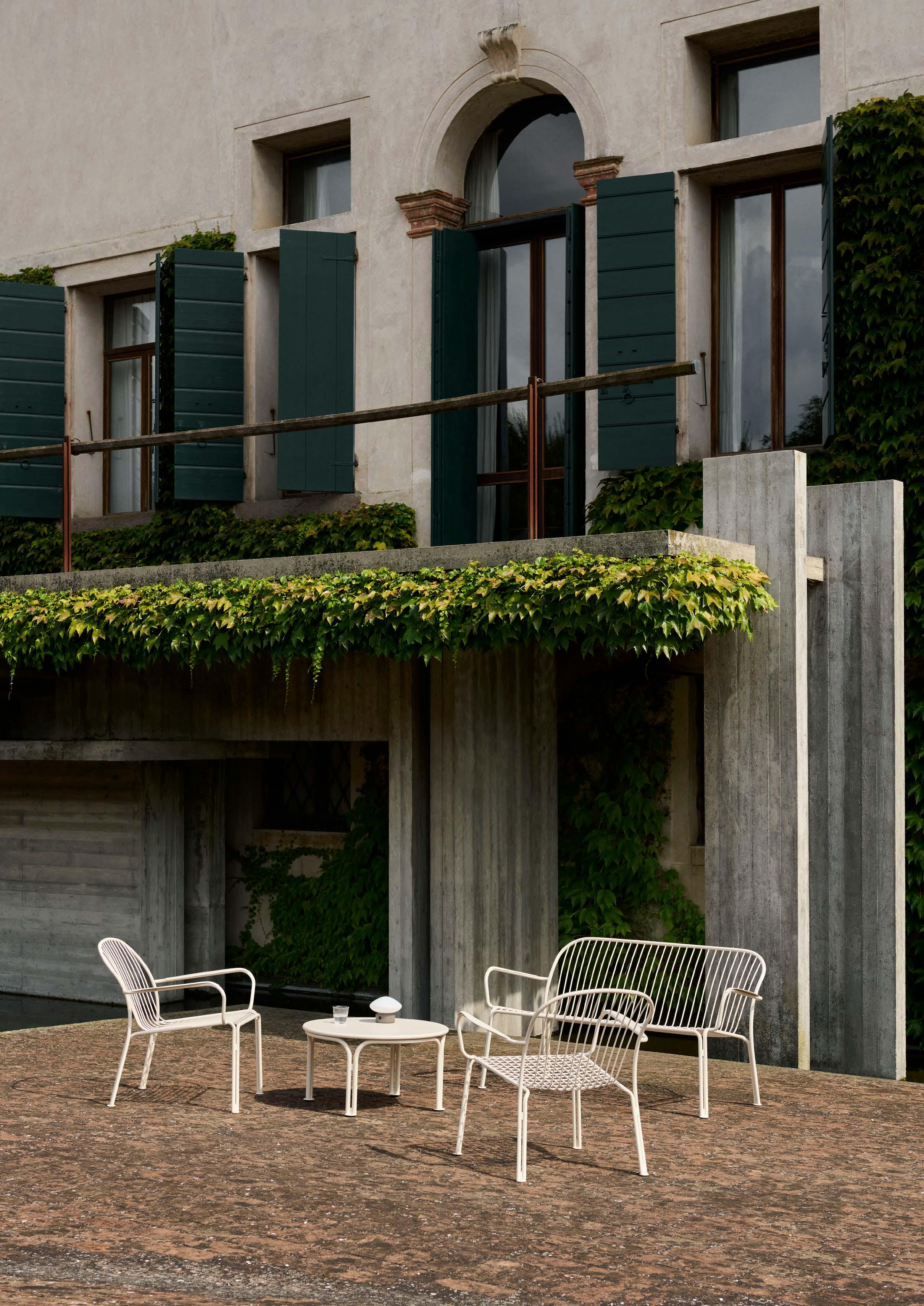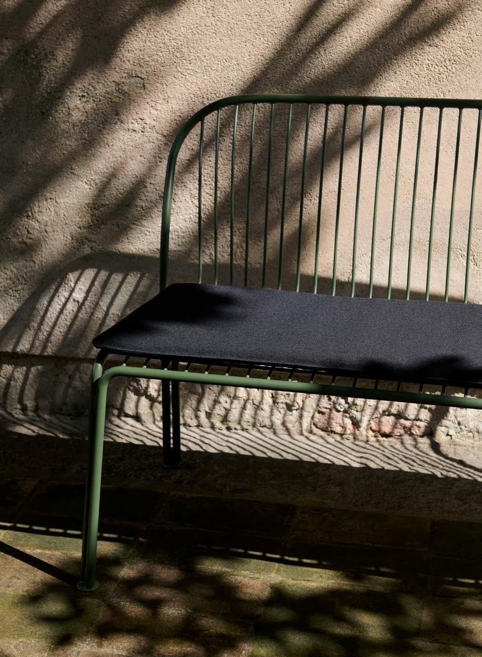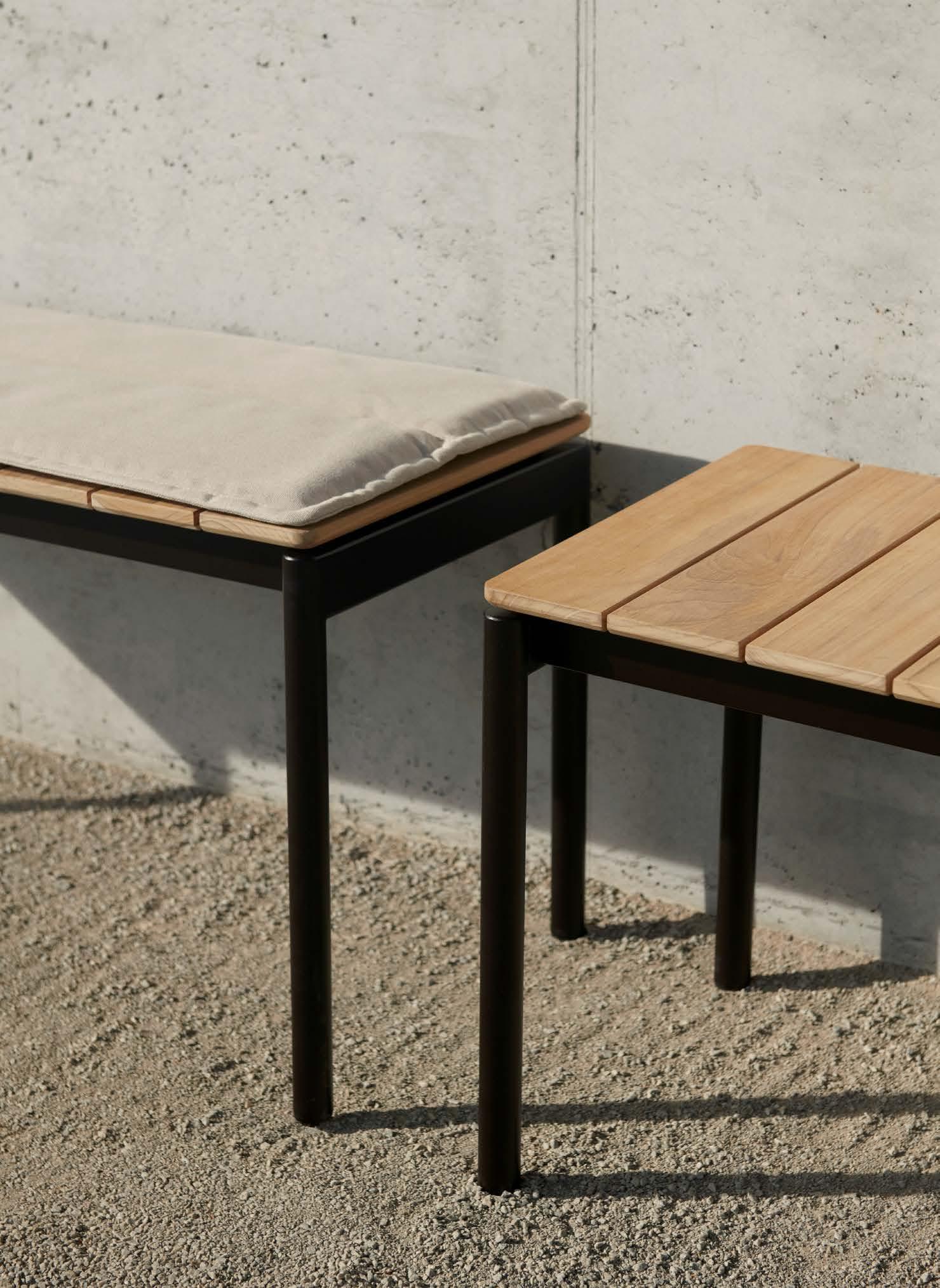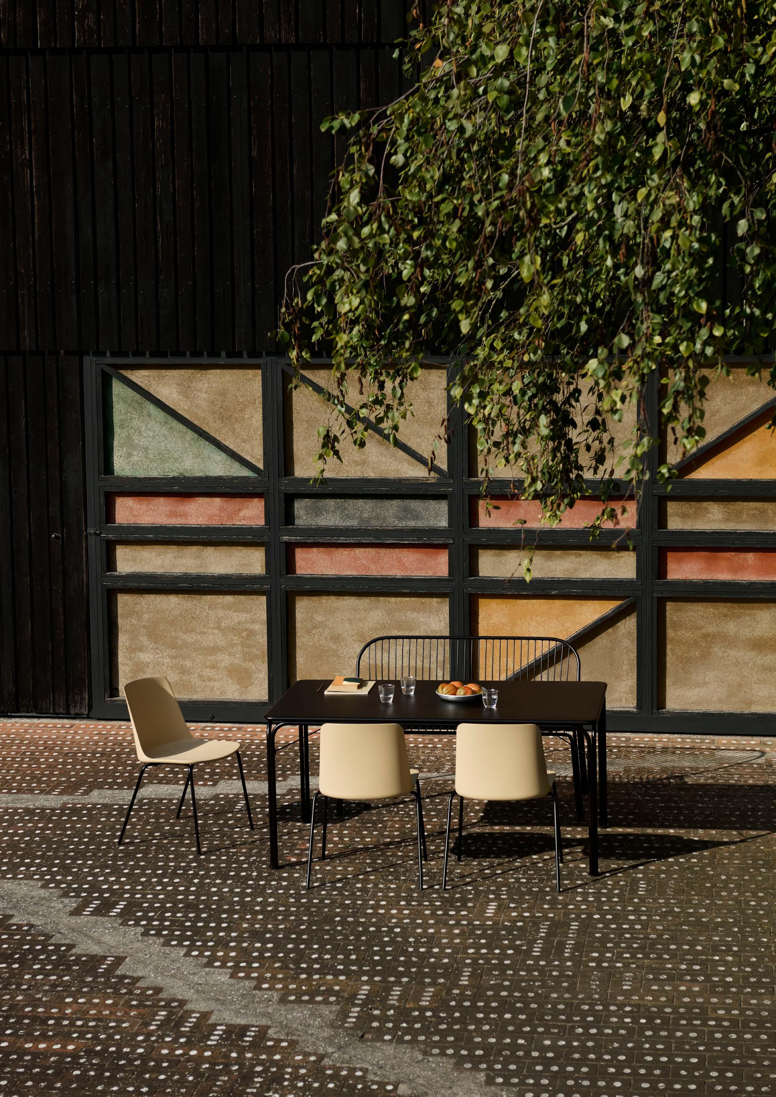 Configured for comfort, stability and versatility, the Thorvald Collection features a stackable side chair and armchair, lounge sofa, dining bench, bench, two café tables, two coffee tables, two dining tables, a stackable lounge chair and a side table, in Warm Black, Bronze Green or Ivory. Seat pads and cushions are available for extra comfort, in a neutral colour and pattern.