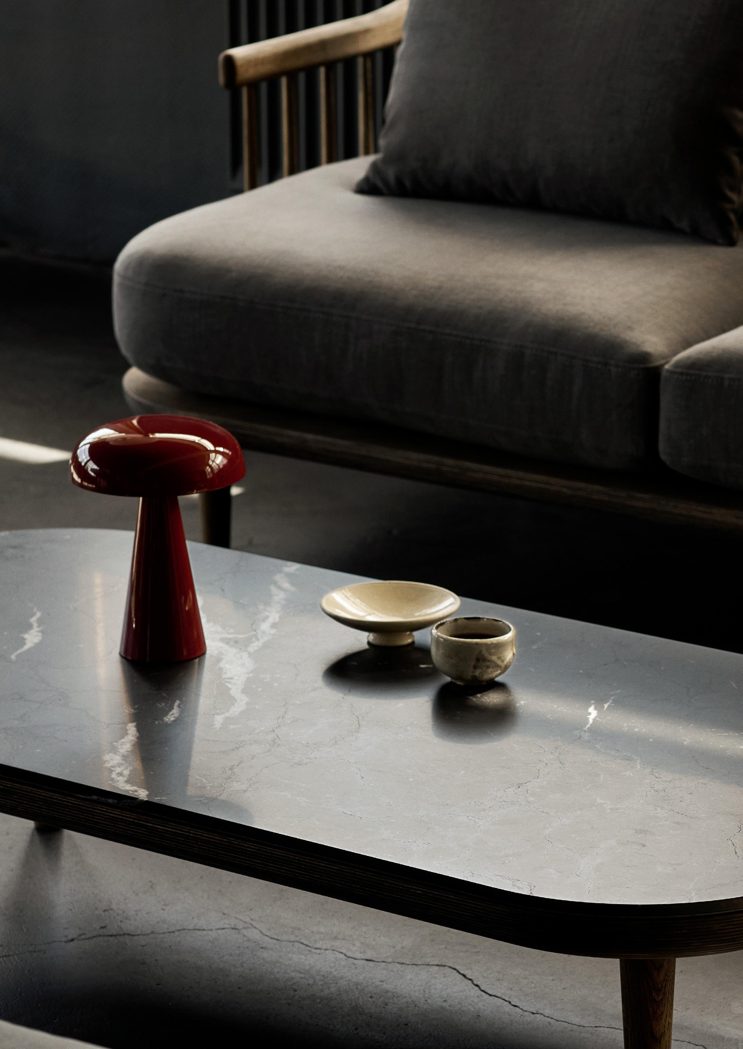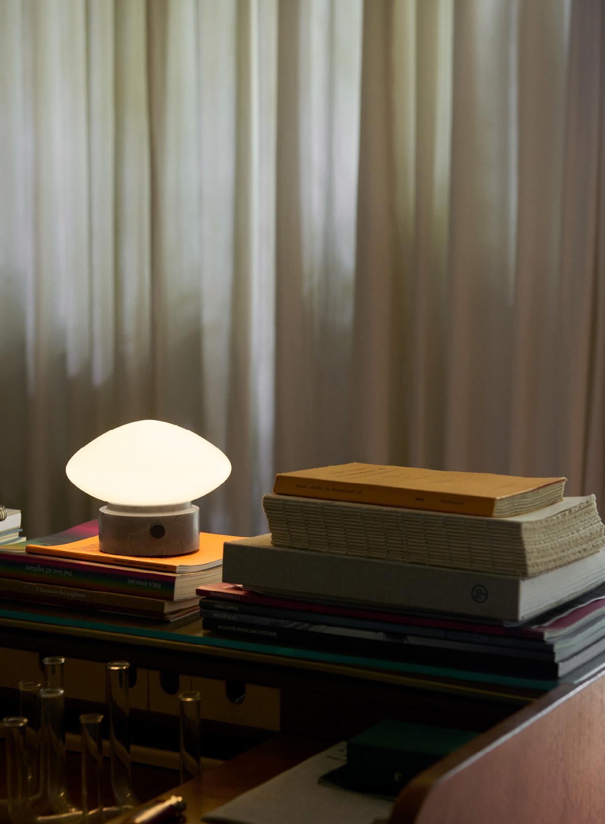 By virtue of its petite size and cordless functionality, the Mist portable lamp succeeds in bringing a sense of intimacy when placed on tables and countertops, emitting a warm glow akin to that of the table lamp model.
