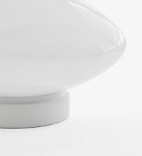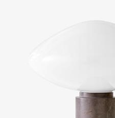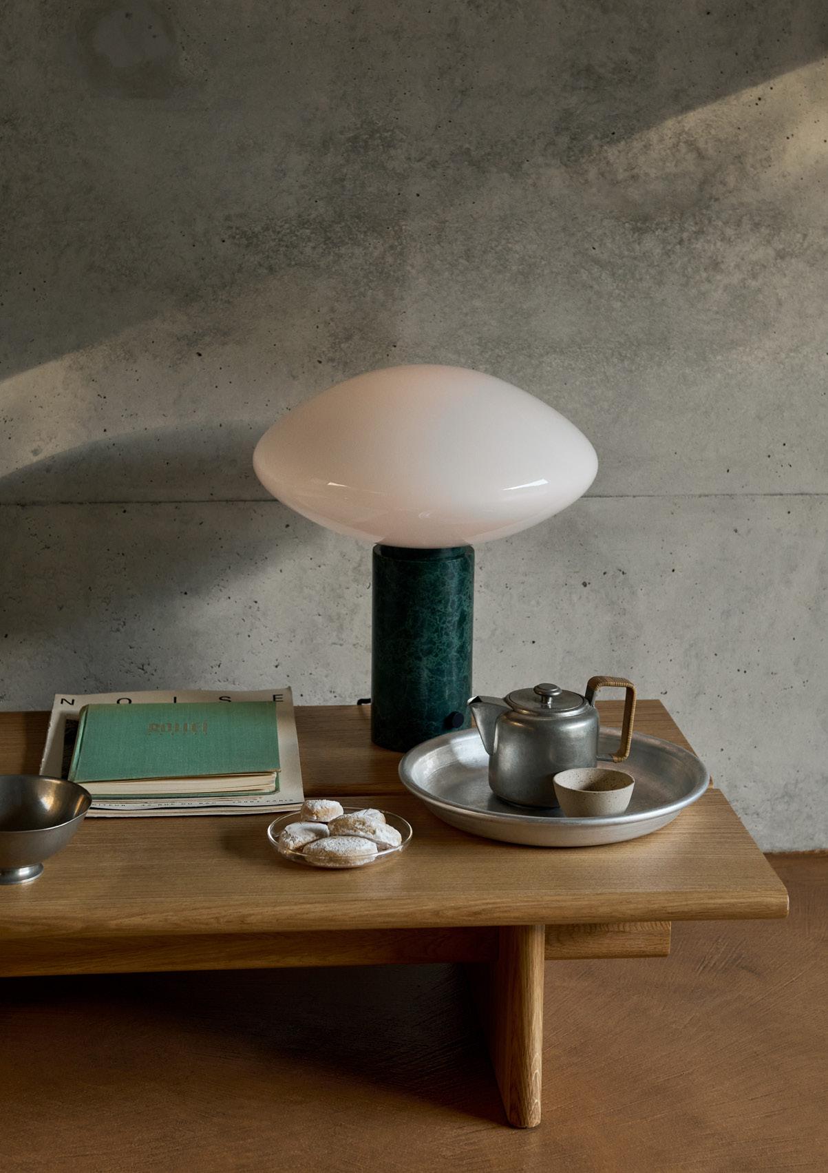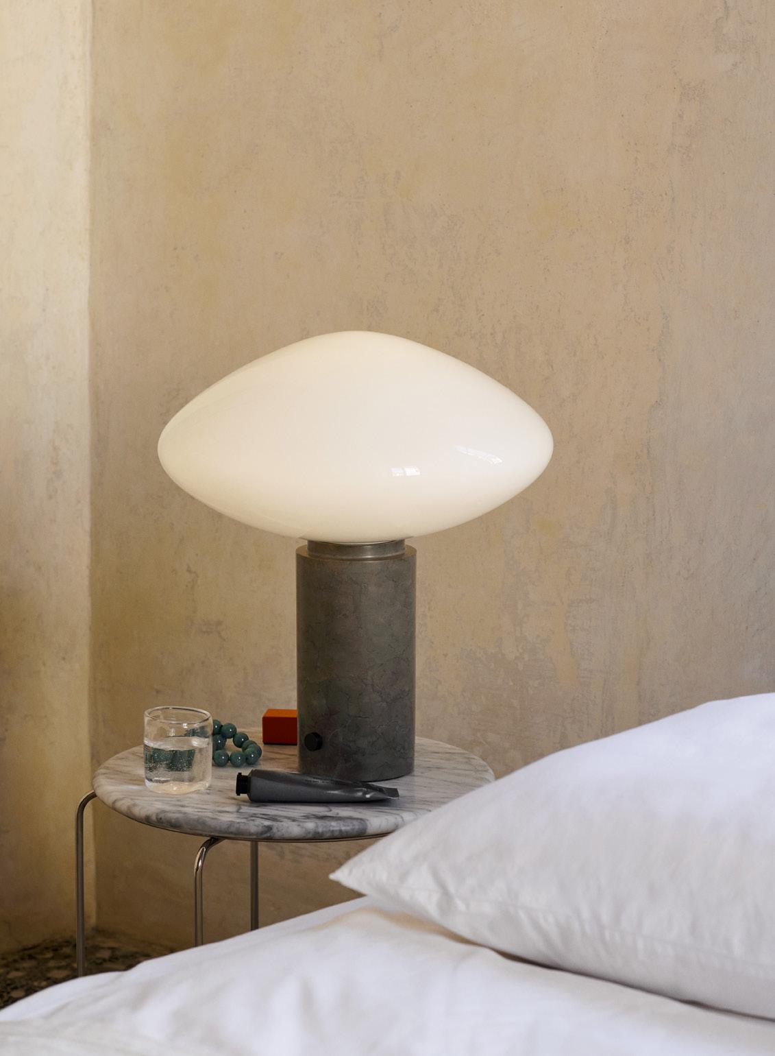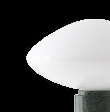 The Mist table lamp, made from mouth-blown opal glass, features a thick marble pillar with a small dimmer switch. The contrast between the light shape of the glass and the solidity of the marble results in a graceful design rich in materiality.