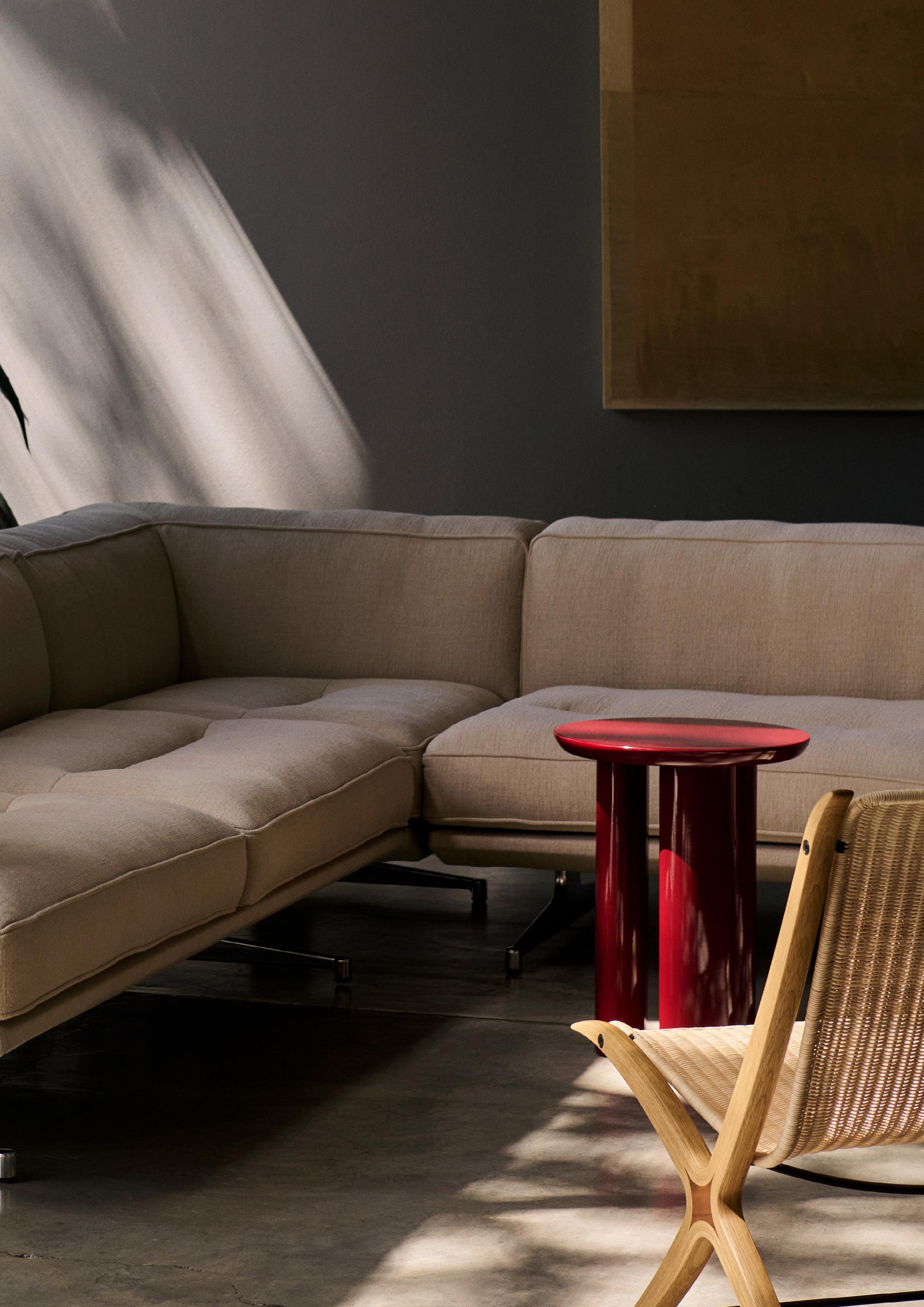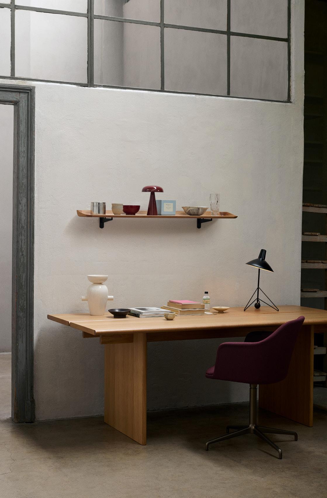 Develius EV1A Hallingdal 0407 I Tung JA3 Burgundy Red I Flowerpot VP4 Chrome-Plated I Inland AV21 & AV32 Clay 0011 w. Warm Black Base I Collect Tray SC65 Lacquered Oak I Collect Glass SC78 Clear I Momento Jug JH38 Polished Stainless Steel