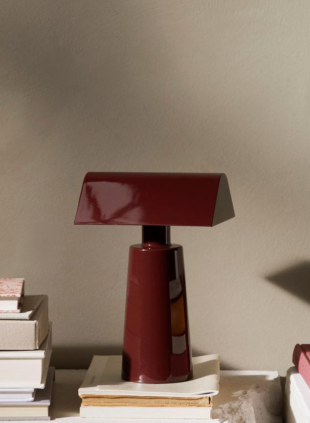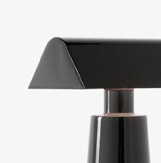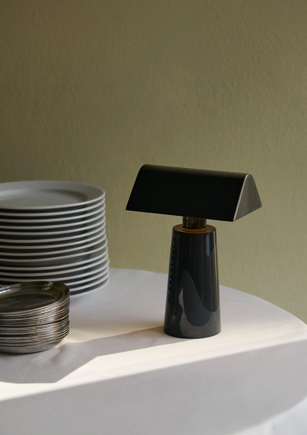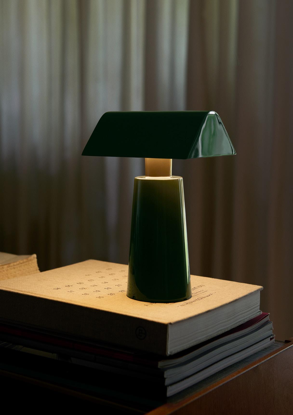 Caret reimagines the linear silhouette of the classic, greenshaded designs known as 'bankers lamps' that can be found in historic libraries. A portable lamp made entirely from lacquered steel, the contemporary design features a rounded base and a long, pyramid-shaped top that emits a soft, diffused light – imbuing soft ambience to every shelf, counter and bedside.