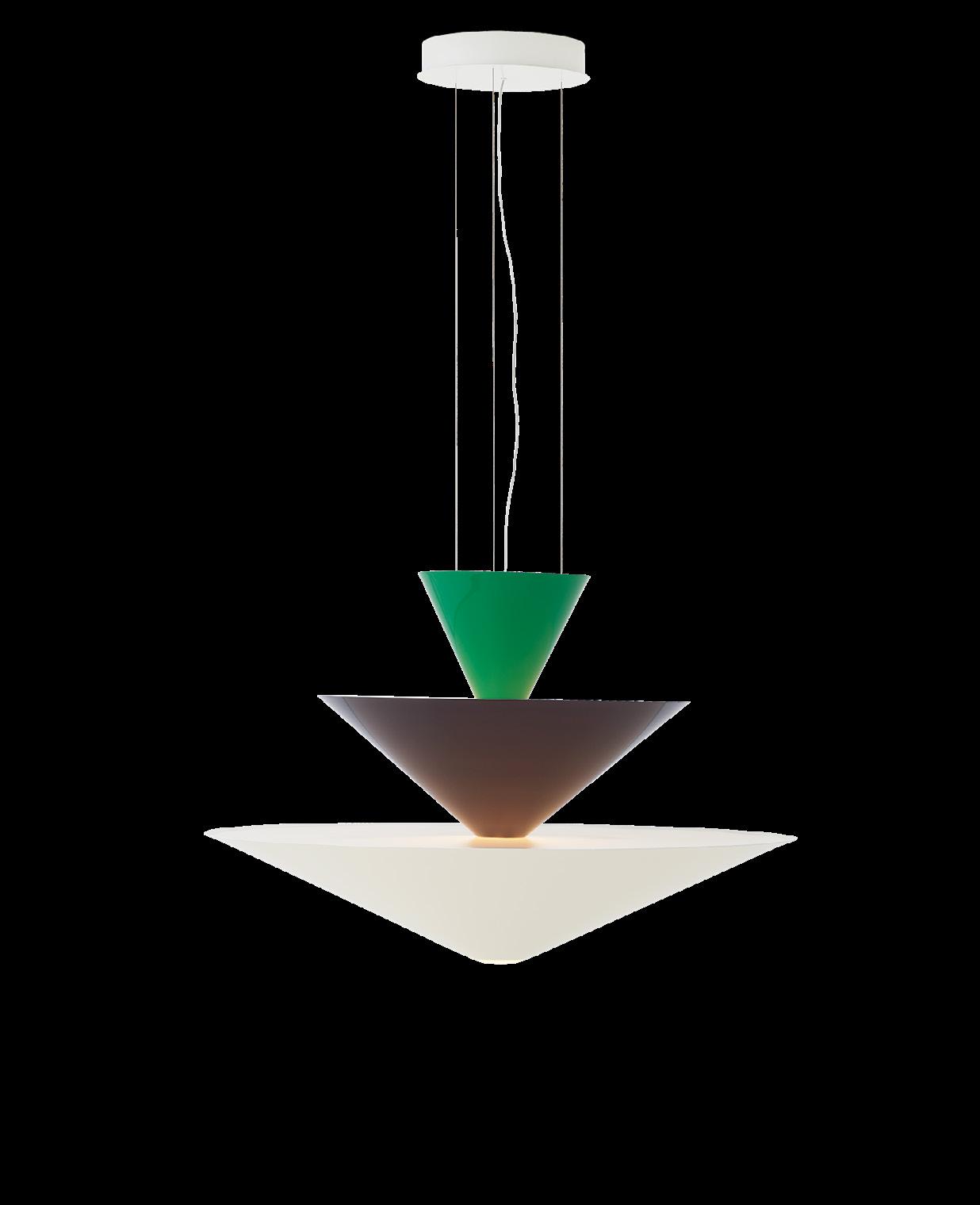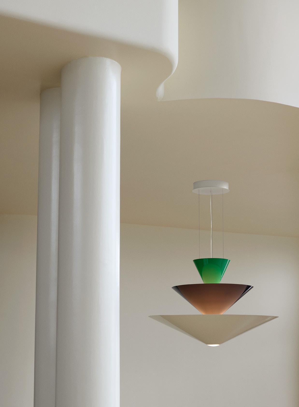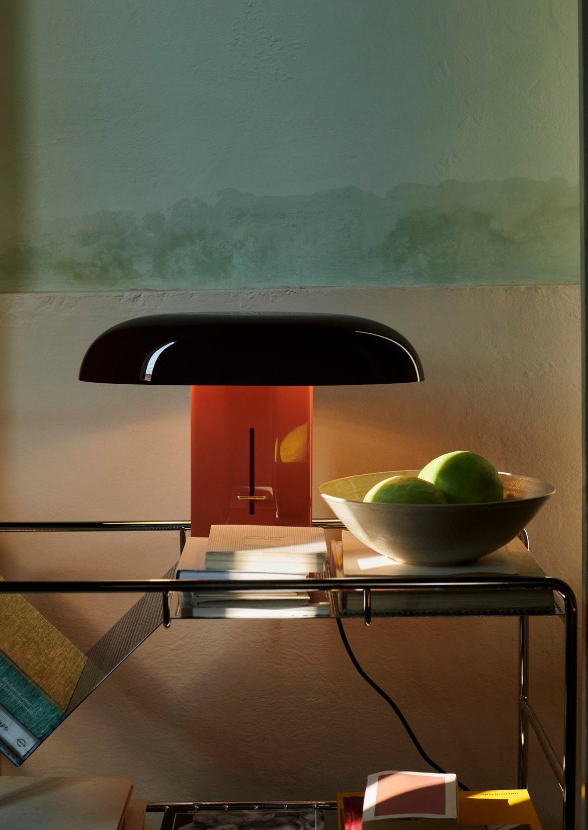 Caret reimagines the linear silhouette of the classic, greenshaded designs known as 'bankers lamps' that can be found in historic libraries. A portable lamp made entirely from lacquered steel, the contemporary design features a rounded base and a long, pyramid-shaped top that emits a soft, diffused light – imbuing soft ambience to every shelf, counter and bedside.