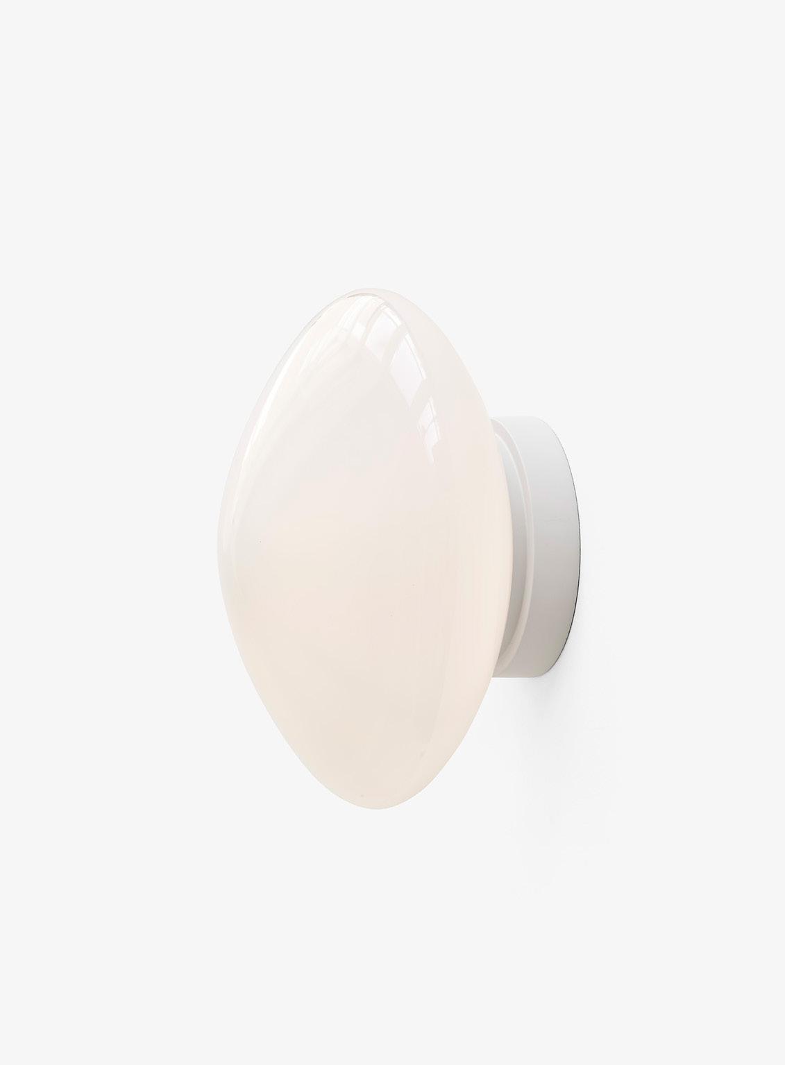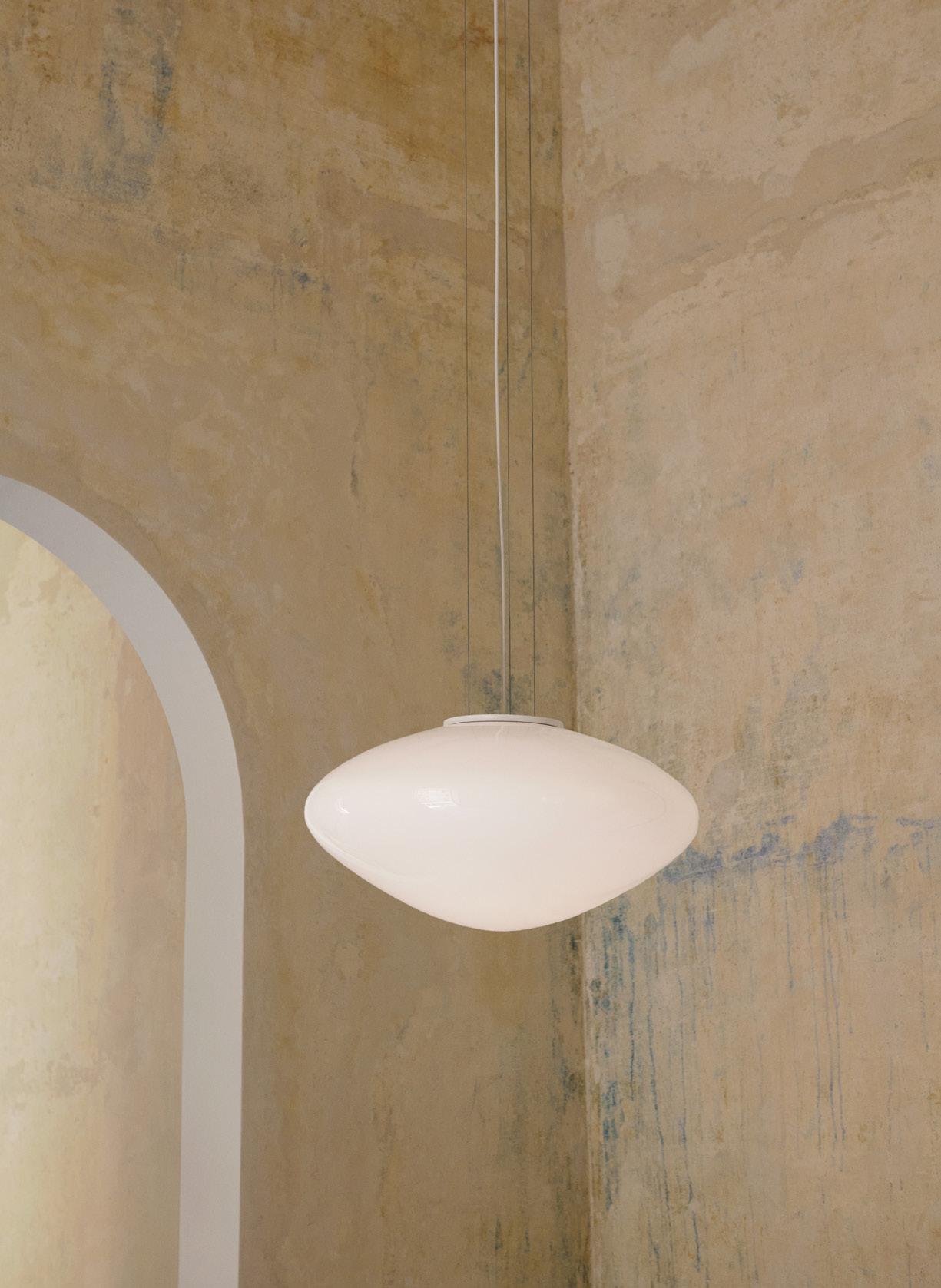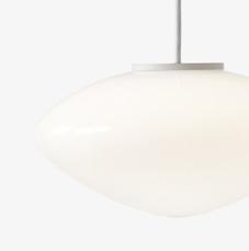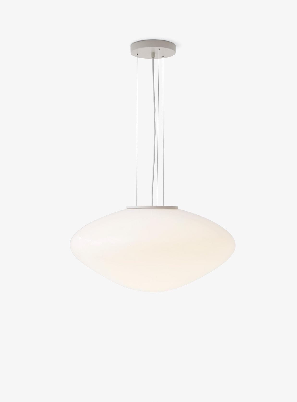 Mouth-blown satinised opal glass, steel & textile cord.